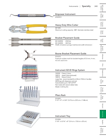 243 Self Ligating Metal Cosmetic Patient Buccal Bands & Adhesives Wire Elastomerics Mini Fixed & Stops Extraoral Instruments Supplies Practice Brackets Brackets Brackets Setups Tubes Attachments Implants Functional & Hooks MarketingInstruments | SpecialtyEmpower Instrument678-901CHeavy Duty Wire Cutter007-005Maximum cutting capacity: .080\Bracket Placement Guide001-034934 .018 Slot001-034935 .022 SlotWidth of exterior prongs matches slot width dimensionBoone Bracket Placement Guide010-010Fixed pin scribes mark for bracket heights of 3.5 mm, 4 mm, 4.5 mm and 5 mmInstrument EZ-ID Rings System70Z205 Classic Colors70Z215 Jewel Colors (pictured)70Z210 Vibrant ColorsLarge Size - recommended for 6.35mm-9.52mm handles200 Rings with dispenser and rackAutoclavable up to 136%u00b0C/275%u00b0FNot made with natural rubber latexMade in USA by ZircPliers Rack010-8355 1/2\Instrument Tray010-8362 1/8\