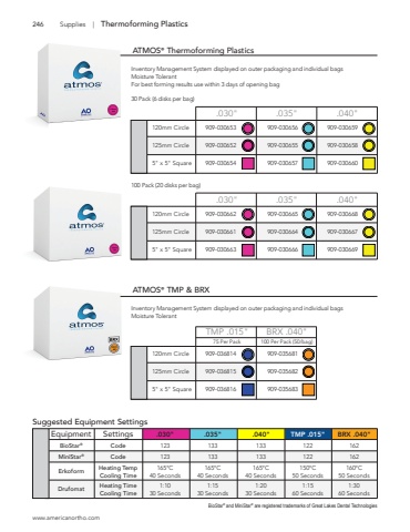 www.americanortho.com246 Supplies | Thermoforming PlasticsATMOS%u00ae Thermoforming PlasticsATMOS%u00ae TMP & BRX Inventory Management System displayed on outer packaging and individual bagsMoisture TolerantFor best forming results use within 3 days of opening bag30 Pack (6 disks per bag) .030\.035\.040\120mm Circle 909-030653 909-030656 909-030659125mm Circle 909-030652 909-030655 909-0306585\909-030654 909-030657 909-030660100 Pack (20 disks per bag) .030\.035\.040\120mm Circle 909-030662 909-030665 909-030668125mm Circle 909-030661 909-030664 909-0306675\909-030663 909-030666 909-030669Inventory Management System displayed on outer packaging and individual bagsMoisture Tolerant TMP .015\BRX .040\75 Per Pack 100 Per Pack (50/bag)120mm Circle 909-036814 909-035681125mm Circle 909-036815 909-0356825\909-036816 909-035683Suggested Equipment SettingsEquipment Settings .030\.035\.040\TMP .015\BRX .040\BioStar%u00ae Code 123 133 133 122 162MiniStar%u00ae Code 123 133 133 122 162Erkoform Heating Temp 165%u00b0C 165%u00b0C 165%u00b0C 150%u00b0C 160%u00b0C Cooling Time 40 Seconds 40 Seconds 40 Seconds 50 Seconds 50 SecondsDrufomat Heating Time 1:10 1:15 1:20 1:15 1:30 Cooling Time 30 Seconds 30 Seconds 30 Seconds 60 Seconds 60 SecondsBioStar%u00ae and MiniStar%u00ae are registered trademarks of Great Lakes Dental Technologies