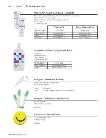 www.americanortho.com248Platypus%u00ae Orthodontic FlossersSlides under the wire for easy flossing No threading requiredT130 30 per packT103 75 patient packs (3 per pack, 225 total flossers)Platypus%u00ae Orthodontic ToothbrushesIndividually Packed12 toothbrushes per packBP-201-GOrthodontic Smile Buttons1 7/8%u201d diameter (4.8 cm)100 per package853-500Supplies | Patient AccessoriesPlaqueHD%u00ae Plaque Identifying ToothpasteBlue-Green color sticks to plaque for easy identification and removalGluten Free and certified veganReduces chance of enamel scarring upon debond4.1 oz Tube12 Tubes per CasePlaqueHD%u00ae Remineralizing Mouth RinseAlcohol freeGentle Whitening16 fl oz Bottle12 Bottles per Case Fresh Mint Berry Bubble GumShip to Country 12 per Case 12 per CaseUSA & Puerto Rico 241-PHD-M-USA-CS 246-PHD-BB-USA-CSCanada 265-PHD-M-CA-CS 275-PHD-BB-CA-CSChina (ROC) 321-PHD-M-ROC-CS 326-PHD-BB-ROC-CSShip to Country 12 Per CaseUSA & Puerto Rico 351-PHD-MRWR-USA-CSCanada 366-PHD-MRWR-CA-CS