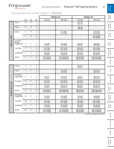25 Self Ligating Metal Cosmetic Patient Buccal Bands & Adhesives Wire Elastomerics Mini Fixed & Stops Extraoral Instruments Supplies Practice Brackets Brackets Brackets Setups Tubes Attachments Implants Functional & Hooks MarketingNote: All Empower Metal hooks are distalMANDIBULARCompatible with a Roth* System - PASSIVE PASSIVE .018 PASSIVE .022 Torq Ang R/L No Hook With Hook No Hook With HookCentral +12 +5 R 585-1112 L 585-2112 Lateral +8 +9 R 585-128 L 585-228 Cuspid -2 +9 R 575-1302B 585-1302B L 575-2302B 585-2302B -2 +11 R 585-1302AB L 585-2302AB 1st and 2nd Bicuspid Standard Pad -7 0 R 575-1407 575-1407B 585-1407 585-1407B L 575-2407 575-2407B 585-2407 585-2407B True Offset -7 0 R 575-71407 575-71407B 585-71407 585-71407B L 575-72407 575-72407B 585-72407 585-72407B Extended Pad -7 0 R 575-81407 575-81407B 585-81407 585-81407B L 575-82407 575-82407B 585-82407 585-82407B BX Pad -7 0 R 575-18-91407 575-18-91407HD 585-22-91407 585-22-91407HD L 575-18-92407 575-18-92407HD 585-22-92407 585-22-92407HDAnteriors -1 0 R 585-4101 L 585-3101 Cuspid -11 +7 R 575-4311B 585-4311B L 575-3311B 585-3311B1st Bicuspid Standard Pad -17 0 R 575-4417 575-4417B 585-4417 585-4417B L 575-3417 575-3417B 585-3417 585-3417B True Offset -17 0 R 575-74417 575-74417B 585-74417 585-74417B L 575-73417 575-73417B 585-73417 585-73417B Extended Pad -17 0 R 575-84417 575-84417B 585-84417 585-84417B L 575-83417 575-83417B 585-83417 585-83417B BX Pad -17 0 R 575-18-94417 575-18-94417HD 585-22-94417 585-22-94417HD L 575-18-93417 575-18-93417HD 585-22-93417 585-22-93417HD2nd Bicuspid Standard Pad -22 0 R 575-4522 575-4522B 585-4522 585-4522B L 575-3522 575-3522B 585-3522 585-3522B True Offset -22 0 R 575-74522 575-74522B 585-74522 585-74522B L 575-73522 575-73522B 585-73522 585-73522B Extended Pad -22 0 R 575-84522 575-84522B 585-84522 585-84522B L 575-83522 575-83522B 585-83522 585-83522B BX Pad -22 0 R 575-18-94522 575-18-94522HD 585-22-94522 585-22-94522HD L 575-18-93522 575-18-93522HD 585-22-93522 585-22-93522HD MAXILLARYSelf Ligating Brackets | Empower%u00ae Self Ligating Systems