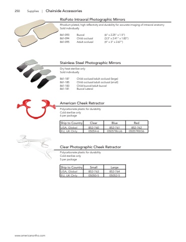 www.americanortho.com250RioFoto Intraoral Photographic MirrorsRhodium plated, high reflectivity and durability for accurate imaging of intraoral anatomySold individually861-093 Buccal (6\861-094 Child occlusal (3.3\861-095 Adult occlusal (4\Stainless Steel Photographic MirrorsDry heat sterilize onlySold individually861-187 Child occlusal/adult occlusal (large)861-185 Child occlusal/adult occlusal (small)861-183 Child buccal/adult buccal861-181 Buccal LateralAmerican Cheek RetractorPolycarbonate plastic for durabilityCold sterilize only6 per packageClear Photographic Cheek RetractorPolycarbonate plastic for durabilityCold sterilize only5 per packageSupplies | Chairside AccessoriesShip to Country Clear Blue RedUSA, Global 852-760 852-761 852-762EU, UK Only 05054-6 05057BLU6 05057RED6Ship to Country Small LargeUSA, Global 852-763 852-764EU, UK Only 05050-5 05052-5