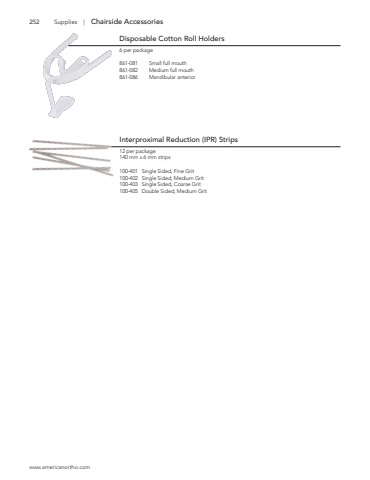 www.americanortho.com252Disposable Cotton Roll Holders6 per package861-081 Small full mouth861-082 Medium full mouth861-086 Mandibular anteriorInterproximal Reduction (IPR) Strips 12 per package 140 mm x 6 mm strips100-401 Single Sided, Fine Grit100-402 Single Sided, Medium Grit 100-403 Single Sided, Coarse Grit100-405 Double Sided, Medium Grit Supplies | Chairside Accessories