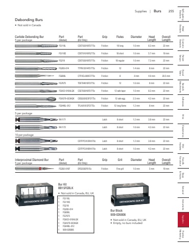 255 Self Ligating Metal Cosmetic Patient Buccal Bands & Adhesives Wire Elastomerics Mini Fixed & Stops Extraoral Instruments Supplies Practice Brackets Brackets Brackets Setups Tubes Attachments Implants Functional & Hooks MarketingDebonding Burs%u2022 Not sold in CanadaCarbide Debonding Bur Part Part Grip Flutes Diameter Head Overall5 per package (Global) (EU Only) Length LengthFG118L CDET02016FD775c Friction 18 long 1.6 mm 8.3 mm 22 mmFG118S CDET01016FG775c Friction 18 short 1.6 mm 5.7 mm 19 mmFG218 CDET03016FD775c Friction 18 regular 1.6 mm 7.3 mm 22 mmFG283-014 TTPN12014FD775c Friction 12 1.4 mm 8 mm 22 mmFG699L CTFXCL009FZ775c Friction 8 .9 mm 4.9 mm 20.5 mmFG7675 TDET04016FD775c Friction 12 1.6 mm 8 mm 22 mmFGH22-016ALGK CSET03016FD775c Friction 12 safe taper 1.6 mm 8.3 mm 22 mmFGH379-023AGK CEGG02023FD775c Friction 12 safe egg 2.3 mm 4.2 mm 22 mmFGH48L-012 TFLA01012FD775c Friction 12 long flame 1.2 mm 8 mm 22 mm5 per packageRA1171 Latch 8 short 1.2 mm 3.8 mm 22 mmRA1172 Latch 8 short 1.6 mm 4.3 mm 22 mm10 per packageCDTFPC012RA170c Latch 8 short 1.2 mm 3.8 mm 22 mmCDTFPC016RA170c Latch 8 short 1.6 mm 4.3 mm 22 mmInterproximal Diamond Bur Part Part Grip Grit Diameter Head Overall5 per package (Global) (EU Only) Length LengthFG392-016F DFG5582F615c Friction Fine grit 1.6 mm 5 mm 19 mmSupplies | BursBur KitBB15FGBLK%u2022 Not sold in Canada, EU, UK1 FG118L1 FG118S1 FG2181 FG283-0141 FG699L1 FG76751 FGH22-016ALGK1 FGH379-023AGK1 FGH48L-0121 909-026806Bur Block909-026806%u2022 Not sold in Canada, EU, UK%u2022 Empty, no burs included