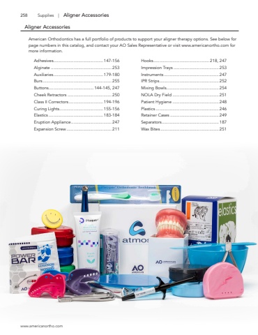www.americanortho.com258Aligner AccessoriesAmerican Orthodontics has a full portfolio of products to support your aligner therapy options. See below for page numbers in this catalog, and contact your AO Sales Representative or visit www.americanortho.com for more information.Supplies | Aligner AccessoriesAdhesives..........................................147-156Alginate ................................................... 253Auxiliaries..........................................179-180Burs.......................................................... 255Buttons......................................144-145, 247Cheek Retractors ..................................... 250Class II Correctors.............................194-196Curing Lights.....................................155-156Elastics ..............................................183-184Eruption Appliance.................................. 247Expansion Screw...................................... 211Hooks............................................... 218, 247Impression Trays ...................................... 253Instruments .............................................. 247IPR Strips.................................................. 252Mixing Bowls............................................ 254NOLA Dry Field ....................................... 251Patient Hygiene ....................................... 248Plastics ..................................................... 246Retainer Cases ......................................... 249Separators................................................ 187Wax Bites ................................................. 251
