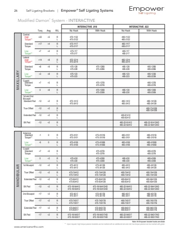 26www.americanortho.comSelf Ligating Brackets | Empower%u00ae Self Ligating SystemsMAXILLARY MANDIBULARModified Damon* System - INTERACTIVE INTERACTIVE .018 INTERACTIVE .022 Torq Ang R/L No Hook With Hook No Hook With HookCentral High +22 +5 R 475-1122 485-1122 Torque** L 475-2122 485-2122 Standard +17 +4 R 475-1117 485-1117 Torque L 475-2117 485-2117 Low +7 +4 R 475-117 485-117 Torque** L 475-217 485-217 Lateral High +14 +8 R 475-1214 485-1214 Torque** L 475-2214 485-2214 Standard +8 +9 R 475-128 475-128B 485-128 485-128B Torque L 475-228 475-228B 485-228 485-228B Low +3 +8 R 475-123 485-123 485-123B Torque** L 475-223 485-223 485-223B Cuspid Standard +7 +5 R 475-137B 485-137B Torque L 475-237B 485-237B Low 0 +8 R 475-130B 485-130 485-130B Torque** L 475-230B 485-230 485-230B1st and 2ndBicuspid Standard Pad -12 +2 R 475-1412 485-1412 485-1412B L 475-2412 485-2412 485-2412B True Offset -12 +2 R 485-71412B L 485-72412B Extended Pad -12 +2 R 485-81412 L 485-82412 BX Pad -12 +2 R 485-22-91412 485-22-91412HD L 485-22-92412 485-22-92412HDAnteriors Standard -1 0 R 475-4101 475-4101B 485-4101 485-4101B Torque** L 475-3101 475-3101B 485-3101 485-3101B Low -6 0 R 475-4106 475-4106B 485-4106 485-4106B Torque** L 475-3106 475-3106B 485-3106 485-3106BCuspid Standard +7 +5 R 475-437B 485-437B Torque L 475-337B 485-337B Low 0 +3 R 475-430 475-430B 485-430 485-430B Torque** L 475-330 475-330B 485-330 485-330B1st Bicuspid -12 +2 R 475-4412 475-4412B 485-4412 485-4412B L 475-3412 475-3412B 485-3412 485-3412B True Offset -12 +2 R 475-74412 475-74412B 485-74412 485-74412B L 475-73412 475-73412B 485-73412 485-73412B Extended Pad -12 +2 R 475-84412 475-84412B 485-84412 485-84412B L 475-83412 475-83412B 485-83412 485-83412B BX Pad -12 +2 R 475-18-94412 475-18-94412HD 485-22-94412 485-22-94412HD L 475-18-93412 475-18-93412HD 485-22-93412 485-22-93412HD2nd Bicuspid -17 +2 R 475-4517 475-4517B 485-4517 485-4517B L 475-3517 475-3517B 485-3517 485-3517B True Offset -17 +2 R 475-74517 475-74517B 485-74517 485-74517B L 475-73517 475-73517B 485-73517 485-73517B Extended Pad -17 +2 R 475-84517 475-84517B 485-84517 485-84517B L 475-83517 475-83517B 485-83517 485-83517B BX Pad -17 +2 R 475-18-94517 475-18-94517HD 485-22-94517 485-22-94517HD L 475-18-93517 475-18-93517HD 485-22-93517 485-22-93517HDNote: All Empower bracket hooks are distal** Upon request, high torque passive brackets can be marked with an additional red color dot; low torque passive can be marked with green