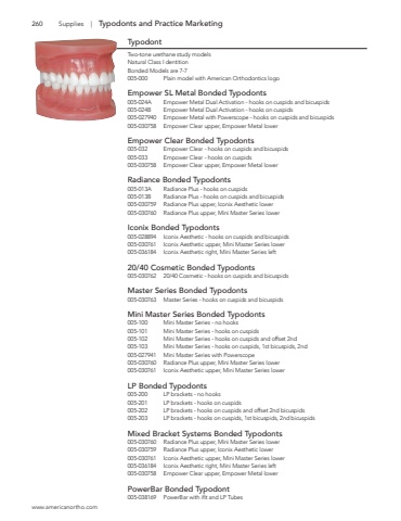 www.americanortho.com260TypodontTwo-tone urethane study modelsNatural Class I dentitionBonded Models are 7-7005-000 Plain model with American Orthodontics logoEmpower SL Metal Bonded Typodonts 005-024A Empower Metal Dual Activation - hooks on cuspids and bicuspids005-024B Empower Metal Dual Activation - hooks on cuspids005-027940 Empower Metal with Powerscope - hooks on cuspids and bicuspids005-030758 Empower Clear upper, Empower Metal lowerEmpower Clear Bonded Typodonts 005-032 Empower Clear - hooks on cuspids and bicuspids005-033 Empower Clear - hooks on cuspids005-030758 Empower Clear upper, Empower Metal lowerRadiance Bonded Typodonts005-013A Radiance Plus - hooks on cuspids 005-013B Radiance Plus - hooks on cuspids and bicuspids005-030759 Radiance Plus upper, Iconix Aesthetic lower005-030760 Radiance Plus upper, Mini Master Series lowerIconix Bonded Typodonts 005-028894 Iconix Aesthetic - hooks on cuspids and bicuspids005-030761 Iconix Aesthetic upper, Mini Master Series lower005-036184 Iconix Aesthetic right, Mini Master Series left20/40 Cosmetic Bonded Typodonts005-030762 20/40 Cosmetic - hooks on cuspids and bicuspidsMaster Series Bonded Typodonts 005-030763 Master Series - hooks on cuspids and bicuspidsMini Master Series Bonded Typodonts 005-100 Mini Master Series - no hooks005-101 Mini Master Series - hooks on cuspids005-102 Mini Master Series - hooks on cuspids and offset 2nd005-103 Mini Master Series - hooks on cuspids, 1st bicuspids, 2nd005-027941 Mini Master Series with Powerscope005-030760 Radiance Plus upper, Mini Master Series lower005-030761 Iconix Aesthetic upper, Mini Master Series lowerLP Bonded Typodonts 005-200 LP brackets - no hooks005-201 LP brackets - hooks on cuspids005-202 LP brackets - hooks on cuspids and offset 2nd bicuspids005-203 LP brackets - hooks on cuspids, 1st bicuspids, 2nd bicuspidsMixed Bracket Systems Bonded Typodonts 005-030760 Radiance Plus upper, Mini Master Series lower005-030759 Radiance Plus upper, Iconix Aesthetic lower005-030761 Iconix Aesthetic upper, Mini Master Series lower005-036184 Iconix Aesthetic right, Mini Master Series left 005-030758 Empower Clear upper, Empower Metal lowerPowerBar Bonded Typodont 005-038169 PowerBar with ifit and LP TubesSupplies | Typodonts and Practice Marketing