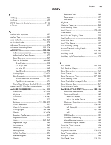 Index 265#10 Ring .......................................................... 18520 Stick.......................................................... 18520/40 Cosmetic Brackets ...........................84-856 Sticks .......................................................... 185AAarhus Mini Implants..................................... 190Aarhus Tray.................................................... 191Acid Etchant.......................................... 150, 151Activation Locks ............................................ 209Adhesive Remover ........................................ 242Adhesive Removing Pliers..................... 227, 234ADHESIVES........................................ 147-156Adhesive Accessories .......................150-152Adhesive PrePaste System....................... 153Band Cements ......................................... 154Bracket Adhesives.............................148-149 BracePaste .......................................... 148 GC Fuji Ortho ..................................... 149No Mix: 30 .......................................... 149 Opal Bond .......................................... 148Curing Lights.....................................155-156Etch Products....................................150-151 BracePaste Etch Accessories .............. 150 Opal Etch Accessories ........................ 151Gishy Goo! Silicone Bracket Relief........... 151Alexander LTS Wire Recommendations ........ 168ALIGNER ACCESSORIES .....................List - 258Adhesives..........................................147-156Alginate ................................................... 253Auxiliaries..........................................179-180Burs.......................................................... 255Buttons......................................144-145, 247Cheek Retractors ..................................... 250Class II Correctors.............................194-196Curing Lights.....................................155-156Elastics ..............................................183-184Eruption Appliance.................................. 247Expansion Screw...................................... 211Hooks............................................... 218, 247Impression Trays ...................................... 253Instruments .............................................. 247IPR Strips.................................................. 252Mixing Bowls............................................ 254NOLA Dry Field ....................................... 251Patient Hygiene ....................................... 248Plastics ..................................................... 246INDEXRetainer Cases ......................................... 249Separators................................................ 187Wax Bites ................................................. 251Alginate......................................................... 253Alginate Flavoring......................................... 253Arch Bending Pliers ....................................... 231Arch Forms .............................................158-159Arch Hooks.................................................... 216Arch Hook Crimping Pliers ............................ 228Arch Lock....................................................... 216Arch Wire Rack .............................................. 257Arch Wire Sleeve........................................... 187ART Auxiliary Spring...................................... 179Atmos Thermoforming Plastics ..................... 246Auxiliaries ...............................................179-180Auxiliary Hook ....................................... 145, 218Auxiliary Light Torquing Arch ........................ 179BBall Hooks ............................................. 145, 218Ball Retainer Clasps....................................... 178Band Cement ................................................ 154Band Pusher .......................................... 238, 241Band Removing Pliers ........................... 227, 234Band Seating Pliers ....................................... 233Band Stackable Storage Kit Box ................... 257Band Storage Box ......................................... 257Band/Cement Scaler ..................................... 242BANDS & ATTACHMENTS ................. 135-146Bondable Attachments ............................ 144Contoured Bands..................................... 142Hard Line Bands.................................. 142Micro 1st Molar Bands ........................ 142Maximum Retention................................. 136MR Bands..........................................136-140 MR Bicuspid........................................ 140MR1..............................................137-138MR2..................................................... 139MRX Bands .............................................. 141Standard Positioning................................ 146Weldable Attachments ............................ 145Weldable Lingual Sheaths ....................... 143Bandtite Glass Ionomer................................. 154Barrel Nut...................................................... 197Bayonet Directors...................................208-209Beta Titanium Wire........................................ 172Bicuspid Tubes .............................................. 133Bird Beak Pliers ..................................... 225, 231