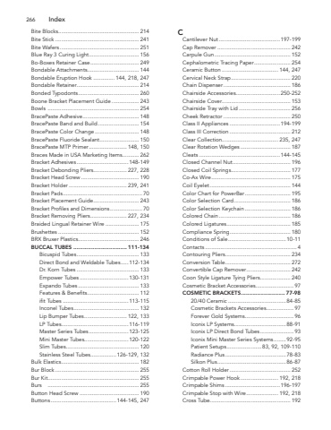 266 IndexBite Blocks..................................................... 214Bite Stick ....................................................... 241Bite Wafers .................................................... 251Blue Ray 3 Curing Light................................. 156Bo-Boxes Retainer Case................................ 249Bondable Attachments.................................. 144Bondable Eruption Hook .............. 144, 218, 247Bondable Retainer......................................... 214Bonded Typodonts........................................ 260Boone Bracket Placement Guide .................. 243Bowls ............................................................ 254BracePaste Adhesive..................................... 148BracePaste Band and Build........................... 154BracePaste Color Change ............................. 148BracePaste Fluoride Sealant.......................... 150BracePaste MTP Primer......................... 148, 150Braces Made in USA Marketing Items........... 262Bracket Adhesives ..................................148-149Bracket Debonding Pliers...................... 227, 228Bracket Head Screw ...................................... 190Bracket Holder ...................................... 239, 241Bracket Pads.................................................... 70Bracket Placement Guide.............................. 243Bracket Profiles and Dimensions ..................... 70Bracket Removing Pliers........................ 227, 234Braided Lingual Retainer Wire ...................... 175Brushettes ..................................................... 152BRX Bruxer Plastics........................................ 246BUCCAL TUBES ................................. 111-134Bicuspid Tubes......................................... 133Direct Bond and Weldable Tubes.....112-134Dr. Korn Tubes ......................................... 133Empower Tubes ................................130-131Expando Tubes ........................................ 133Features & Benefits.................................. 112ifit Tubes ...........................................113-115Inconel Tubes........................................... 132Lip Bumper Tubes............................ 122, 133LP Tubes............................................116-119Master Series Tubes..........................123-125Mini Master Tubes.............................120-122Slim Tubes................................................ 120Stainless Steel Tubes.................126-129, 132Bulk Elastics................................................... 182Bur Block ....................................................... 255Bur Kit............................................................ 255Burs ............................................................ 255Button Head Screw ....................................... 190Buttons ...........................................144-145, 247CCantilever Nut........................................197-199Cap Remover ................................................ 242Carpule Gun.................................................. 152Cephalometric Tracing Paper........................ 254Ceramic Button ..................................... 144, 247Cervical Neck Strap....................................... 220Chain Dispenser............................................ 186Chairside Accessories.............................250-252Chairside Cover............................................. 153Chairside Tray with Lid .................................. 256Cheek Retractor ............................................ 250Class II Appliances .................................194-199Class III Correction ........................................ 212 Clear Collection..................................... 235, 247Clear Rotation Wedges ................................. 187Cleats .....................................................144-145Closed Channel Nut...................................... 196Closed Coil Springs....................................... 177Co-Ax Wire.................................................... 175Coil Eyelet..................................................... 144Color Chart for PowerBar.............................. 195Color Selection Card..................................... 186Color Selection Keychain .............................. 186Colored Chain ............................................... 186Colored Ligatures.......................................... 185Compliance Spring........................................ 180Conditions of Sale......................................10-11Contacts ............................................................ 4Contouring Pliers........................................... 234Conversion Table........................................... 272Convertible Cap Remover............................. 242Coon Style Ligature Tying Pliers.................... 240Cosmetic Bracket Accessories......................... 97COSMETIC BRACKETS........................... 77-9820/40 Ceramic ......................................84-85Cosmetic Brackets Accessories.................. 97Forever Gold Systems................................ 96Iconix LP Systems..................................88-91Iconix LP Direct Bond Tubes ...................... 93Iconix Mini Master Series Systems ........92-95Patient Setups.......................83, 92, 109-110Radiance Plus........................................78-83Silkon Plus.............................................86-87Cotton Roll Holder........................................ 252Crimpable Power Hook......................... 192, 218Crimpable Shims ....................................196-197Crimpable Stop with Wire..................... 192, 218Cross Tube..................................................... 192