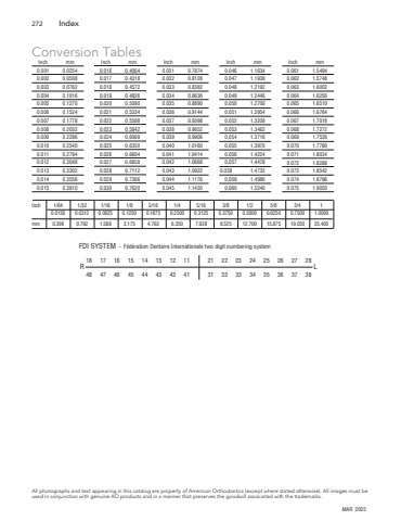 272 IndexFDI SYSTEM - F%u00e9d%u00e9ration Dentaire Internationale two digit numbering system18 17 16 15 14 13 12 11 21 22 23 24 25 26 27 2848 47 46 45 44 43 42 41 31 32 33 34 35 36 37 38R LInch 1/64 1/32 1/16 1/8 3/16 1/4 5/16 3/8 1/2 5/8 3/4 10.0156 0.0312 0.0625 0.1250 0.1875 0.2500 0.3125 0.3750 0.5000 0.6250 0.7500 1.0000mm 0.396 0.792 1.588 3.175 4.763 6.350 7.938 9.525 12.700 15.875 19.050 25.400Conversion TablesInch mm0.001 0.02540.002 0.05080.003 0.07620.004 0.10160.005 0.12700.006 0.15240.007 0.17780.008 0.20320.009 0.22860.010 0.25400.011 0.27940.012 0.30480.013 0.33020.014 0.35560.015 0.3810Inch mm0.031 0.78740.032 0.81280.033 0.83820.034 0.86360.035 0.88900.036 0.91440.037 0.93980.038 0.96520.039 0.99060.040 1.01600.041 1.04140.042 1.06680.043 1.09220.044 1.11760.045 1.1430Inch mm0.016 0.40640.017 0.43180.018 0.45720.019 0.48260.020 0.50800.021 0.53340.022 0.55880.023 0.58420.024 0.60690.025 0.63500.026 0.66040.027 0.68580.028 0.71120.029 0.73660.030 0.7620Inch mm0.046 1.16340.047 1.19380.048 1.21920.049 1.24460.050 1.27000.051 1.29540.052 1.32080.053 1.34620.054 1.37160.055 1.39700.056 1.42240.057 1.4478 0.058 1.47320.059 1.49860.060 1.5240Inch mm0.061 1.54940.062 1.57480.063 1.60020.064 1.62560.065 1.65100.066 1.67640.067 1.70180.068 1.72720.069 1.75260.070 1.77800.071 1.80340.072 1.82880.073 1.85420.074 1.87960.075 1.9050All photographs and text appearing in this catalog are property of American Orthodontics (except where stated otherwise). All images must be used in conjunction with genuine AO products and in a manner that preserves the goodwill associated with the trademarks.MAR 2025