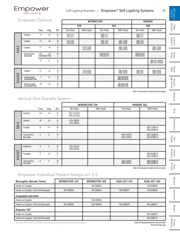 31 Self Ligating Metal Cosmetic Patient Buccal Bands & Adhesives Wire Elastomerics Mini Fixed & Stops Extraoral Instruments Supplies Practice Brackets Brackets Brackets Setups Tubes Attachments Implants Functional & Hooks MarketingSelf Ligating Brackets | Empower%u00ae Self Ligating SystemsNote: All Empower bracket hooks are distal*BX Pad on BicuspidEmpower Individual Patient Setups U/L 5-5McLaughlin, Bennett, Trevisi INTERACTIVE .018 INTERACTIVE .022 DUAL ACT .018 DUAL ACT .022Hooks on Cuspids 126-029943 126-029948Hooks on Cuspids, 1st & 2nd Bicuspids 126-029940 126-029944 126-029947* 126-029949Compatible with RothHooks on Cuspids 126-029945Hooks on Cuspids, 1st & 2nd Bicuspids 126-029942 126-029946 126-029950* 126-029951*Empower 128%u2122 Hooks on Cuspids 126-038620*Hooks on Cuspids, 1st & 2nd Bicuspids 126-038619** American Orthodontics%u2019 prescription versions. No endorsement by the doctor(s) is implied. Empower Options INTERACTIVE PASSIVE .018 .022 .022 Torq Ang R/L No Hook With Hook No Hook With Hook No Hook With HookCentral +7 +4 R 475-117 485-117 585-117 L 475-217 485-217 585-217 Lateral +3 +8 R 475-123 485-123 485-123B 585-123 L 475-223 485-223 485-223B 585-223 Cuspid +7 +5 R 475-137B 485-137B 585-137B L 475-237B 485-237B 585-237B 1st and 2nd -12 +2 R 485-81412 585-81412 Bicuspid Extended Pad L 485-82412 585-82412 0 0 R 585-22-140HD L 585-22-240HDCuspid +7 +5 R 475-437B 485-437B 585-437 585-437B L 475-337B 485-337B 585-337 585-337B 1st Bicuspid -7 0 R 485-84407B Extended Pad L 485-83407B2nd Bicuspid -12 +2 R 485-84512B Extended Pad L 485-83512BMAX MAND MAX MANDVertical Slot Gianelly System INTERACTIVE .018 PASSIVE .022 Torq Ang R/L No Hook With Hook No Hook With HookCentral +12 +5 R 475-1112VS L 475-2112VS Lateral +8 +9 R 475-128VS L 475-228VSCuspid 0 +7 R 585-130BVS L 585-230BVS 1st and 2nd 0 0 R 585-140VS 585-140BVSBicuspid L 585-240VS 585-240BVS Anteriors 0 0 R 475-410VS L 475-310VS Cuspids 0 +5 R 585-430BVS L 585-330BVS1st and 2nd 0 0 R 585-440VS 585-440BVSBicuspid L 585-340VS 585-340BVSNote: All Empower bracket hooks are distalNote: All Empower bracket hooks are distal