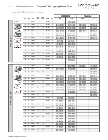 www.americanortho.com32 Self Ligating Brackets | Empower%u00ae Self Ligating Molar TubesEmpower Direct Bond Tubes DIRECT BOND WELDABLE Aux AuxTorq Rot M-D Torq Tube Pad R/L .018 .022 .018 .022 1st Molar 0 10 3.5mm 961/962 R 961-22-160HM L 962-22-260HM -10 10 3.5mm 961/962 R 961-18-1610HM 961-22-1610HM 008-18-1610H 008-22-1610H L 962-18-2610HM 962-22-2610HM 008-18-2610H 008-22-2610H-10 10 3.5mm -10 .018 961/962 R 9612-18-1610HM 9612-22-1610HM 0082-18-1610H 0082-22-1610H L 9622-18-2610HM 9622-22-2610HM 0082-18-2610H 0082-22-2610H-14 10 3.5mm 961/962 R 961-18-1614HM 961-22-1614HM 008-18-1614H 008-22-1614H L 962-18-2614HM 962-22-2614HM 008-18-2614H 008-22-2610H-14 10 3.5mm -10 .018 961/962 R 9612-18-1614HM 9612-22-1614HM 0082-22-1614H L 9622-18-2614HM 9622-22-2614HM 0082-22-2614H-18 10 3.5mm 961/962 R 961-18-1618HM 961-22-1618HM 008-22-1618H L 962-18-2618HM 962-22-2618HM 008-22-2618H0 10 3.5mm 957/958 R 957-18-160H 957-22-160H L 958-18-260H 958-22-260H-10 10 3.5mm 957/958 R 957-18-1610H 957-22-1610H L 958-18-2610H 958-22-2610H-10 10 3.5mm -10 .018 957/958 R 9572-18-1610H 9572-22-1610H L 9582-18-2610H 9582-22-2610H -14 10 3.5mm 957/958 R 957-18-1614H 957-22-1614H L 958-18-2614H 958-22-2614H-14 10 3.5mm -10 .018 957/958 R 9572-18-1614H 9572-22-1614H L 9582-18-2614H 9582-22-2614H-18 10 3.5mm 957/958 R 957-18-1618H 957-22-1618H L 958-18-2618H 958-22-2618H-18 -20 3.5mm -20 .018 957/958 R 9572-22-1618H L 9582-22-2618H 0 0 3.5mm 963/964 R 963-22-460HM 008-18-460H 008-22-460H L 964-22-360HM 008-18-360H 008-22-360H-10 0 3.5mm 963/964 R 963-18-4610HM 963-22-4610HM 008-22-4610H L 964-18-3610HM 964-22-3610HM 008-22-3610H-10 0 3.5mm -10 .018 R 0082-22-4610H L 0082-22-3610H-14 0 3.5mm 963/964 R 963-18-4614HM 963-22-4614HM 008-18-4614H 008-22-4614H L 964-18-3614HM 964-22-3614HM 008-18-3614H 008-22-3614H-20 0 3.5mm 963/964 R 963-18-4620HM 963-22-4620HM 008-18-4620H 008-22-4620H L 964-18-3620HM 964-22-3620HM 008-18-3620H 008-22-3620H-20 0 3.5mm -20 .018 R 9632-18-4620HM 9632-22-4620HM 0082-18-4620H 0082-22-4620H L 9642-18-3620HM 9642-22-3620HM 0082-18-3620H 0082-22-3620H-25 0 3.5mm 963/964 R 963-18-4625HM 963-22-4625HM 008-18-4625H 008-22-4625H L 964-18-3625HM 964-22-3625HM 008-18-3625H 008-22-3625H-25 0 3.5mm -20 .018 R 9632-18-4625HM 9632-22-4625HM 0082-18-4625H 0082-22-4625H L 9642-18-3625HM 9642-22-3625HM 0082-18-3625H 0082-22-3625H-28 0 3.5mm 963/964 R 963-22-4628HM 008-22-4628H L 964-22-3628HM 008-22-3628H-28 0 3.5mm -20 .018 R 0082-22-4628H L 0082-22-3628H0 0 3.5mm 955/956 R 955-18-460H 955-22-460H L 956-18-360H 956-22-360H-10 0 3.5mm 955/956 R 955-18-4610H 955-22-4610H L 956-18-3610H 956-22-3610H-10 0 3.5mm -10 .018 R 9552-18-4610H 9552-22-4610H L 9562-18-3610H 9562-22-3610H-14 0 3.5mm 955/956 R 955-18-4614H 955-22-4614H L 956-18-3614H 956-22-3614H-14 0 3.5mm -10 .018 R 9552-18-4614H 9552-22-4614H L 9562-18-3614H 9562-22-3614H-20 0 3.5mm 955/956 R 955-18-4620H 955-22-4620H L 956-18-3620H 956-22-3620H-20 0 3.5mm -20 .018 R 9552-18-4620H 9552-22-4620H L 9562-18-3620H 9562-22-3620H-25 0 3.5mm 955/956 R 955-18-4625H 955-22-4625H L 956-18-3625H 956-22-3625H-25 0 3.5mm -20 .018 R 9552-18-4625H 9552-22-4625H L 9562-18-3625H 9562-22-3625H-28 0 3.5mm 955/956 R 955-18-4628H 955-22-4628H L 956-18-3628H 956-22-3628H-28 0 3.5mm -20 .018 R 9552-18-4628H 9552-22-4628H L 9562-18-3628H 9562-22-3628HMAXILLARY MANDIBULAR961 / 962957 / 958963 / 964955 / 956