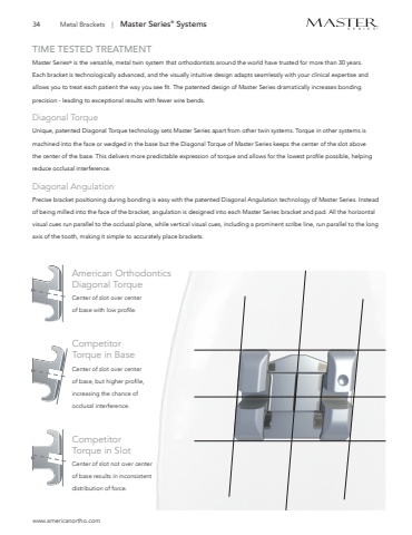 www.americanortho.com34American OrthodonticsDiagonal TorqueCenter of slot over centerof base with low profile.CompetitorTorque in BaseCenter of slot over centerof base, but higher profile,increasing the chance ofocclusal interference.CompetitorTorque in SlotCenter of slot not over centerof base results in inconsistent distribution of force.Metal Brackets | Master Series%u00ae SystemsTIME TESTED TREATMENTMaster Series%u00ae is the versatile, metal twin system that orthodontists around the world have trusted for more than 30 years. Each bracket is technologically advanced, and the visually intuitive design adapts seamlessly with your clinical expertise and allows you to treat each patient the way you see fit. The patented design of Master Series dramatically increases bonding precision - leading to exceptional results with fewer wire bends.Diagonal TorqueUnique, patented Diagonal Torque technology sets Master Series apart from other twin systems. Torque in other systems is machined into the face or wedged in the base but the Diagonal Torque of Master Series keeps the center of the slot above the center of the base. This delivers more predictable expression of torque and allows for the lowest profile possible, helping reduce occlusal interference.Diagonal AngulationPrecise bracket positioning during bonding is easy with the patented Diagonal Angulation technology of Master Series. Instead of being milled into the face of the bracket, angulation is designed into each Master Series bracket and pad. All the horizontal visual cues run parallel to the occlusal plane, while vertical visual cues, including a prominent scribe line, run parallel to the long axis of the tooth, making it simple to accurately place brackets.