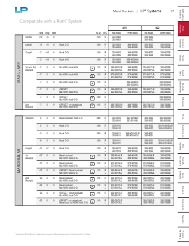 Self Ligating Metal Cosmetic Patient Buccal Bands & Adhesives Wire Elastomerics Mini Fixed & Stops Extraoral Instruments Supplies PracticeBrackets Brackets Brackets Setups Tubes Attachments Implants Functional & Hooks Marketing37MAXILLARYMetal Brackets | LP%u00ae SystemsCompatible with a Roth* System .018 .022 Torq Ang Rot M-D R/L No hook With hook No hook With hookCentral +12 +5 0 .140 R 393-9060 393-9062 L 393-9061 393-9063Lateral +8 +9 0 Hook D-G .100 R 393-9003 393-9003B 393-9023 393-9023B L 393-9004 393-9004B 393-9024 393-9024BCuspid -2 +10 0 Hook D-G .100 R 393-9005 393-9005B 393-9025 393-9025B L 393-9006 393-9006B 393-9026 393-9026B -2 +10 0 Hook M-G .100 R 393-9005 393-9005HM L 393-9006 393-9006HM1st and 2nd -7 0 0 No HGW, hook M-G .110 R 393-9007UR 393-9008B 393-9027UR 393-9028BBicuspid L 393-9007UL 393-9009B 393-9027UL 393-9029B -7 0 0 No HGW, hook M-G .110 R 973-9007UR 973-9008B 973-9027UR 973-9028B L 973-9007UL 973-9009B 973-9027UL 973-9029B -7 0 0 No HGW, hook D-G .110 R 393-9008HD 393-9028HD L 393-9009HD 393-9029HD -7 0 0 OFFSET .110 R 393-8907UR 393-8908B 393-8927UR 393-8928B No HGW, hook M-G L 393-8907UL 393-8909B 393-8927UL 393-8929B -7 0 0 OFFSET .100 R 393-8928HD No HGW, hook D-G L 393-8929HD2nd -7 0 0 OFFSET - on raised pad .110 R 393-7907UR 393-7908B 393-7927UR 393-7928BBicuspid No HGW, hook M-G L 393-7907UL 393-7909B 393-7927UL 393-7929B Anteriors 0 0 0 Bevel occlusal, hook D-G .080 R 393-9010 393-9010BR 393-9030 393-9030BR L 393-9010 393-9010BL 393-9030 393-9030BL 0 0 0 Hook D-G .100 R 393-9110 393-9130 393-9130HDLR L 393-9110 393-9130 393-9130HDLL -5 0 0 Hook D-G .080 R 393-9011 393-9011HDLR 393-9031 L 393-9011 393-9011HDLL 393-9031 -6 0 0 Hook D-G .100 R 393-9111 393-9131 393-9131HDLR L 393-9111 393-9131 393-9131HDLLCuspid -11 +7 0 Hook D-G .100 R 393-9012 393-9012B 393-9032 393-9032B L 393-9013 393-9013B 393-9033 393-9033B1st -17 0 0 Bevel occlusal .110 R 393-9014LR 393-9015B 393-9034LR 393-9035BBicuspid No HGW, hook D-G L 393-9014LL 393-9016B 393-9034LL 393-9036B -17 0 0 Bevel occlusal .110 R 973-9014LR 973-9015B 973-9034LR 973-9035B No HGW, hook D-G L 973-9014LL 973-9016B 973-9034LL 973-9036B -17 0 0 OFFSET - Bevel occlusal .110 R 393-8914LR 393-8915B 393-8934LR 393-8935B No HGW, hook D-G L 393-8914LL 393-8916B 393-8934LL 393-8936B 2nd -22 0 0 Bevel occlusal .110 R 393-9017LR 393-9018B 393-9037LR 393-9038BBicuspid No HGW, hook D-G L 393-9017LL 393-9019B 393-9037LL 393-9039B -22 0 0 Bevel occlusal .110 R 973-9017LR 973-9018B 973-9037LR 973-9038B No HGW, hook D-G L 973-9017LL 973-9019B 973-9037LL 973-9039B -22 0 0 OFFSET - Bevel occlusal .110 R 393-8917LR 393-8918B 393-8937LR 393-8938B No HGW, hook D-G L 393-8917LL 393-8919B 393-8937LL 393-8939B -22 0 0 OFFSET - on raised pad .110 R 393-7917LR 393-7937LR 393-7938B Bevel occl, no HGW, hook D-G L 393-7917LL 393-7937LL 393-7939B* American Orthodontics%u2019 prescription versions. No endorsement by the doctor(s) is implied. MANDIBULAR