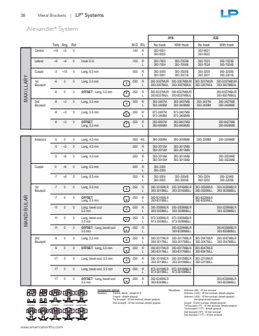 www.americanortho.com38 MANDIBULAR MAXILLARYMetal Brackets | LP%u00ae SystemsAlexander* System .018 .022 Torq Ang Rot M-D R/L No hook With hook No hook With hookCentral +15 +5 0 .140 R 393-9001 393-9021 L 393-9002 393-9022Lateral +9 +9 0 Hook D-G .100 R 393-7003 393-7003B 393-7023 393-7023B L 393-7004 393-7004B 393-7024 393-7024B Cuspid -3 +10 0 Lang, 6.5 mm .050 R 393-3000 393-3000B 393-3200 393-3200B L 393-3001 393-3001B 393-3201 393-3201B1st -6 0 0 Lang, 5.5 mm .050 R 393-3007MUR 393-3007MBUR 393-3207MUR 393-3207MBURBicuspid L 393-3007MUL 393-3007MBUL 393-3207MUL 393-3207MBUL -6 0 0 OFFSET - Lang, 5.5 mm .050 R 393-8337MUR 393-8337MBUR 393-8357MBUR L 393-8337MUL 393-8337MBUL 393-8357MBUL2nd -8 +3 0 Lang, 5.5 mm .050 R 393-3407M 393-3407MB 393-3427M 393-3427MBBicuspid L 393-3408M 393-3408MB 393-3428M 393-3428MB -8 +3 0 Lang, 5.5 mm .050 R 973-3407M 973-3407MB L 973-3408M 973-3408MB -8 +3 0 OFFSET .050 R 393-8407M 393-8407MB 393-8427MB Lang, 5.5 mm L 393-8408M 393-8408MB 393-8428MBAnteriors -5 0 0 Lang, 4.5 mm .050 R/L 393-3008M 393-3008MB 393-3208M 393-3208MB -5 +2 0 Lang, 4.5 mm .050 R 393-3012M 393-3012MB L 393-3013M 393-3013MB -5 +6 0 Lang, 4.5 mm .050 R 393-3014M 393-3014MB 393-3024MB L 393-3015M 393-3015MB 393-3025MB Cuspid 0 +6 0 Lang, 6.5 mm .050 R 393-3304 L 393-3305 -7 +6 0 Lang, 6.5 mm .050 R 393-3004 393-3004B 393-3204 393-3204B L 393-3005 393-3005B 393-3205 393-3205B 1st -7 0 0 Lang, 5.5 mm .050 R 393-3016MLR 393-3016MBLR 393-3026MLR 393-3026MBLRBicuspid L 393-3016MLL 393-3016MBLL 393-3026MLL 393-3026MBLL -7 0 0 OFFSET .050 R 393-8316MLR 393-8326MLR Lang, 5.5 mm L 393-8316MLL 393-8326MLL -11 0 0 Lang, bevel occl .050 R 393-3009MLR 393-3009MBLR 393-3209MBLR 5.5 mm L 393-3009MLL 393-3009MBLL 393-3209MBLL -11 0 0 Lang, bevel occl .050 R 973-3009MLR 973-3009MBLR 5.5 mm L 973-3009MLL 973-3009MBLL -11 0 0 OFFSET - Lang, bevel occl .050 R 393-8339MBLR 393-8358MBLR 5.5 mm L 393-8339MBLL 393-8358MBLL 2nd -9 0 0 Lang, 5.5 mm .050 R 393-3017MLR 393-3017MBLR 393-3047MLR 393-3047MBLRBicuspid L 393-3017MLL 393-3017MBLL 393-3047MLL 393-3047MBLL -9 0 0 OFFSET - Lang, 5.5 mm .050 R 393-8317MLR 393-8317MBLR 393-8347MLR L 393-8317MLL 393-8317MBLL 393-8347MLL -17 0 0 Lang, bevel occl, 5.5 mm .050 R 393-3010MLR 393-3010MBLR 393-3210MLR L 393-3010MLL 393-3010MBLL 393-3210MLL -17 0 0 Lang, bevel occl, 5.5 mm .050 R 973-3010MLR 973-3010MBLR L 973-3010MLL 973-3010MBLL -17 0 0 OFFSET - Lang, bevel occl .050 R 393-8340MLR 393-8359MBLR 5.5 mm L 393-8340MLL 393-8359MBLLPERMANENT MARKSMaxillary Central, lateral - dimple D-GCuspid - dimple gingival1st bicuspid - ID line occlusal, dimple gingival2nd bicuspid - ID line occlusal, dimple gingival CENTRAL LATERAL CUSPID 1st BICUSPID 2nd BICUSPIDMandibular Anteriors (0A) - ID line occlusalAnteriors (+2A) - ID line occlusal, dimple gingivalAnteriors (+6A) - ID line occlusal, dimple gingival,dot gingival and occlusalCuspid - ID line occlusal, dimple gingival1st bicuspid (-7T) - ID line occlusal, dimple gingival1st bicuspid (-11T) - dimple gingival2nd bicuspid (-9T) - ID line occlusal2nd bicuspid (-17T) - ID line occlusal