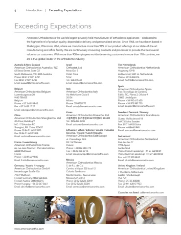 www.americanortho.com4 Introduction | Exceeding ExpectationsExceeding ExpectationsAmerican Orthodontics is the world%u2019s largest privately held manufacturer of orthodontic appliances %u2013 dedicated to the highest level of product quality, dependable delivery, and personalized service. Since 1968, we have been based in Sheboygan, Wisconsin, USA, where we manufacture more than 98% of our product offerings at our state-of-the-art manufacturing and office facility. We are continuously innovating products and processes to provide the best overall value to our customers. With more than 900 employees worldwide serving customers in more than 110 countries, we are a true global leader in the orthodontic industry.Australia & New ZealandAmerican Orthodontics Australia / NZ63 Stead Street, Suite G2South Melbourne, VIC 3205 AustraliaPhone: 00 61 3 9091 6707Fax: 00 61 3 9091 6706Email: aoaust@americanortho.comBelgiumAmerican Orthodontics BelgiumLuxemburgstraat 209140 TEMSEBelgiumPhone: +32 3 651 99 45Fax: +32 3 653 17 27Email: csbelgium@americanortho.comChinaAmerican Orthodontics Shanghai Co. Ltd4th Floor, Building 9NO. 173 Handan RDShanghai, P.R. China 200437Phone: 00 86 21 6652 5323Fax: 00 86 21 6652 3918Email: cschina@americanortho.comFrance / LuxembourgAmerican Orthodontics France65, rue Jean Monnet - Parc des Collines68200 MulhouseFrance Phone: +33 89 66 94 80Email: fr.info@americanortho.comGermany / Austria / HungaryAmerican Orthodontics GmbHNeuenburger Stra%u00dfe 15a79379 M%u00fcllheimFreecall Germany: 0800 0264636Freecall Austria: 0800 080015 Phone Hungary: +36 30 367 5661 Email: de.info@americanortho.comIsraelOrthostat, LtdMota Gor 5Petah Tikva %u05d9%u05e9%u05e8%u05d0%u05dcTel.: 036411733Email: csisrael@americanortho.comItalyAmerican Orthodontics ItalyVia Melchiorre Gioia 820124MilanoPhone: 0294750772Email: aoitaly@americanortho.comKoreaAmerican Orthodontics Korea Co. Ltd.%uc11c%uc6b8%ud2b9%ubcc4%uc2dc %uc911%uad6c %ud1b5%uc77c%ub85c 86 %ubc14%ube44%uc5e53%ucc28 1018%ud638Tel.: (02)6399-6232Email: aokorea@americanortho.comLithuania / Latvia / Estonia / Croatia / Slovakia Slovenia / Poland / Czech RepublicAmerican Orthodontics East Europeul. Czarodzieja 16/403-116 WarsawPolandPhone: +48 882-084-778Fax: +48 22 408 63 95Email: cseasteurope@americanortho.comMexicoAmerican Orthodontics MexicoS. de R.L. de C.V.Camino al Vapor 202 local 12Colonia ZambranoMontemorelos - Nuevo LeonMexico C.P. 67512Phone: 00 52 82626 35449Fax: 00 52 82626 33304Email: csmexico@americanortho.comThe NetherlandsAmerican Orthodontics NetherlandsHogeweg 139 BZaltbommel, 5301 LL NetherlandsPhone: 0418-226 016Email: AONL@americanortho.comSpainAmerican Orthodontics SpainParc Tecnol%u00f2gic de GardenyEdifici TIC, Planta 2, Oficina 925003 LleidaSpainPhone: +34 910 612 630Phone: +34 973 982 720Email: aospain@americanortho.com Sweden / Denmark / NorwayAmerican Orthodontics ScandinaviaGustav III%u2019s Boulevard 18169 73 Solna SwedenBox 3117 169 03 SolnaPhone: +4686601949Email: aoscand@americanortho.comSwitzerlandAmerican Orthodontics SwitzerlandRue des Iles 171994 AprozSwitzerlandPhone (French speaking): +41 27 322 88 81Phone (German speaking): +41 27 322 88 83Fax: +41 27 322 88 82Email: ch.info@americanortho.comUnited Kingdom / IrelandAmerican Orthodontics United Kingdom7 The Barns, Milton LaneCastor, PeterboroughPE5 7DHPhone: 01733 308088Fax: 00 441 628 477923Email: uksales@americanortho.comCountries not listed: cs@americanortho.com