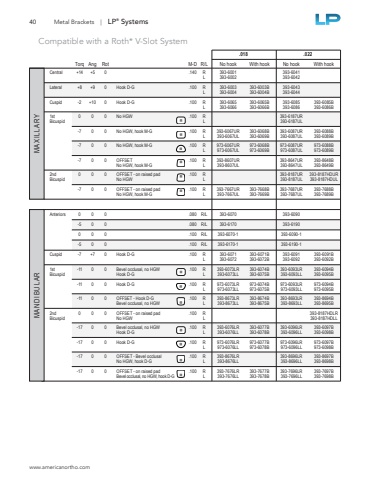 www.americanortho.com40 Metal Brackets | LP%u00ae SystemsMANDIBULAR MAXILLARYCompatible with a Roth* V-Slot System .018 .022 Torq Ang Rot M-D R/L No hook With hook No hook With hookCentral +14 +5 0 .140 R 393-6001 393-6041 L 393-6002 393-6042Lateral +8 +9 0 Hook D-G .100 R 393-6003 393-6003B 393-6043 L 393-6004 393-6004B 393-6044 Cuspid -2 +10 0 Hook D-G .100 R 393-6065 393-6065B 393-6085 393-6085B L 393-6066 393-6066B 393-6086 393-6086B1st 0 0 0 No HGW .100 R 393-6187URBicuspid L 393-6187UL -7 0 0 No HGW, hook M-G .100 R 393-6067UR 393-6068B 393-6087UR 393-6088B L 393-6067UL 393-6069B 393-6087UL 393-6089B -7 0 0 No HGW, hook M-G .100 R 973-6067UR 973-6068B 973-6087UR 973-6088B L 973-6067UL 973-6069B 973-6087UL 973-6089B -7 0 0 OFFSET .100 R 393-8607UR 393-8647UR 393-8648B No HGW, hook M-G L 393-8607UL 393-8647UL 393-8649B2nd 0 0 0 OFFSET - on raised pad .100 R 393-8187UR 393-8187HDURBicuspid No HGW L 393-8187UL 393-8187HDUL -7 0 0 OFFSET - on raised pad .100 R 393-7667UR 393-7668B 393-7687UR 393-7688B No HGW, hook M-G L 393-7667UL 393-7669B 393-7687UL 393-7689BAnteriors 0 0 0 .080 R/L 393-6070 393-6090 -5 0 0 .080 R/L 393-6170 393-6190 0 0 0 .100 R/L 393-6070-1 393-6090-1 -5 0 0 .100 R/L 393-6170-1 393-6190-1 Cuspid -7 +7 0 Hook D-G .100 R 393-6071 393-6071B 393-6091 393-6091B L 393-6072 393-6072B 393-6092 393-6092B1st -11 0 0 Bevel occlusal, no HGW .100 R 393-6073LR 393-6074B 393-6093LR 393-6094BBicuspid Hook D-G L 393-6073LL 393-6075B 393-6093LL 393-6095B -11 0 0 Hook D-G .100 R 973-6073LR 973-6074B 973-6093LR 973-6094B L 973-6073LL 973-6075B 973-6093LL 973-6095B -11 0 0 OFFSET - Hook D-G .100 R 393-8673LR 393-8674B 393-8693LR 393-8694B Bevel occlusal, no HGW L 393-8673LL 393-8675B 393-8693LL 393-8695B2nd 0 0 0 OFFSET - on raised pad .100 R 393-8187HDLRBicuspid No HGW L 393-8187HDLL -17 0 0 Bevel occlusal, no HGW .100 R 393-6076LR 393-6077B 393-6096LR 393-6097B Hook D-G L 393-6076LL 393-6078B 393-6096LL 393-6098B -17 0 0 Hook D-G .100 R 973-6076LR 973-6077B 973-6096LR 973-6097B L 973-6076LL 973-6078B 973-6096LL 973-6098B -17 0 0 OFFSET - Bevel occlusal .100 R 393-8676LR 393-8696LR 393-8697B No HGW, hook D-G L 393-8676LL 393-8696LL 393-8698B -17 0 0 OFFSET - on raised pad .100 R 393-7676LR 393-7677B 393-7696LR 393-7697B Bevel occlusal, no HGW, hook D-G L 393-7676LL 393-7678B 393-7696LL 393-7698B