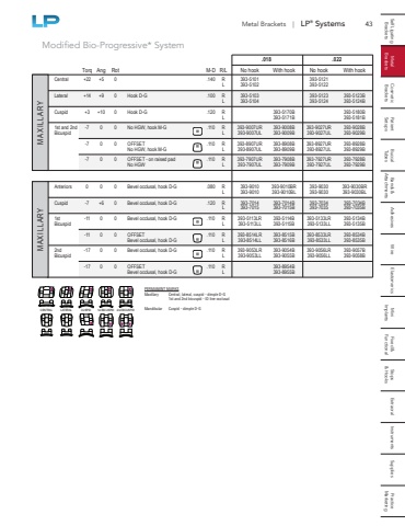 Self Ligating Metal Cosmetic Patient Buccal Bands & Adhesives Wire Elastomerics Mini Fixed & Stops Extraoral Instruments Supplies PracticeBrackets Brackets Brackets Setups Tubes Attachments Implants Functional & Hooks MarketingMetal Brackets | LP 43 %u00ae SystemsPERMANENT MARKSMaxillary Central, lateral, cuspid - dimple D-G1st and 2nd bicuspid - ID line occlusalMandibular Cuspid - dimple D-G CENTRAL LATERAL CUSPID 1st BICUSPID 2nd BICUSPIDModified Bio-Progressive* System .018 .022 Torq Ang Rot M-D R/L No hook With hook No hook With hookCentral +22 +5 0 .140 R 393-5101 393-5121 L 393-5102 393-5122Lateral +14 +9 0 Hook D-G .100 R 393-5103 393-5123 393-5123B L 393-5104 393-5124 393-5124BCuspid +3 +10 0 Hook D-G .120 R 393-5170B 393-5180B L 393-5171B 393-5181B 1st and 2nd -7 0 0 No HGW, hook M-G .110 R 393-9007UR 393-9008B 393-9027UR 393-9028BBicuspid L 393-9007UL 393-9009B 393-9027UL 393-9029B -7 0 0 OFFSET .110 R 393-8907UR 393-8908B 393-8927UR 393-8928B No HGW, hook M-G L 393-8907UL 393-8909B 393-8927UL 393-8929B -7 0 0 OFFSET - on raised pad .110 R 393-7907UR 393-7908B 393-7927UR 393-7928B No HGW L 393-7907UL 393-7909B 393-7927UL 393-7929B Anteriors 0 0 0 Bevel occlusal, hook D-G .080 R 393-9010 393-9010BR 393-9030 393-9030BR L 393-9010 393-9010BL 393-9030 393-9030BLCuspid -7 +6 0 Bevel occlusal, hook D-G .120 R 393-7014 393-7014B 393-7034 393-7034B L 393-7015 393-7015B 393-7035 393-7035B 1st -11 0 0 Bevel occlusal, hook D-G .110 R 393-5113LR 393-5114B 393-5133LR 393-5134BBicuspid L 393-5113LL 393-5115B 393-5133LL 393-5135B -11 0 0 OFFSET .110 R 393-8514LR 393-8515B 393-8533LR 393-8534B Bevel occlusal, hook D-G L 393-8514LL 393-8516B 393-8533LL 393-8535B2nd -17 0 0 Bevel occlusal, hook D-G .110 R 393-9053LR 393-9054B 393-9056LR 393-9057BBicuspid L 393-9053LL 393-9055B 393-9056LL 393-9058B -17 0 0 OFFSET .110 R 393-8954B Bevel occlusal, hook D-G L 393-8955B MAXILLARY MAXILLARY