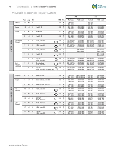 www.americanortho.com46 Metal Brackets | Mini Master%u00ae SystemsMANDIBULAR MAXILLARYMcLaughlin, Bennett, Trevisi* System .018 .022 Torq Ang Rot M-D R/L No hook With hook No hook With hookCentral +17 +4 0 .140 R 390-1014 390-1016 L 390-1015 390-1017Lateral +10 +8 0 Hook D-G .115 R 390-1503 390-1503B 390-1603 390-1603B L 390-1504 390-1504B 390-1604 390-1604B Cuspid -7 +7 0 Hook D-G .122 R 390-1705 390-1705B 390-1805 390-1805B L 390-1706 390-1706B 390-1806 390-1806B 0 +8 0 Hook D-G .122 R 390-5235 390-5237B 390-5245 390-5247B L 390-5236 390-5238B 390-5246 390-5248B1st and 2nd -7 0 0 HGW, hook M-G .120 R 390-0007UR 390-0104B 390-0027UR 390-0114BBicuspid L 390-0007UL 390-0105B 390-0027UL 390-0115B -7 0 0 HGW, hook M-G .120 R 970-0007UR 970-0104B 970-0027UR 970-0114B L 970-0007UL 970-0105B 970-0027UL 970-0115B -7 0 0 HGW, hook D-G .120 R 390-0104HD 390-0114HD L 390-0105HD 390-0115HD -7 0 0 Hook D-G .120 R 970-0114HD L 970-0115HD -7 0 0 OFFSET .120 R 390-8807UR 390-8808B 390-8827UR 390-8828B HGW, hook M-G L 390-8807UL 390-8809B 390-8827UL 390-8829B2nd -7 0 0 On raised pad .120 R 390-1507UR 390-7508B 390-1607UR 390-7608BBicuspid HGW, hook M-G L 390-1507UL 390-7509B 390-1607UL 390-7609BOPTIONS -7 0 0 OFFSET .120 R 390-8177UR 390-8178B 390-8277UR 390-8278B HGW, hook M-G, on raised pad L 390-8177UL 390-8179B 390-8277UL 390-8279BAnteriors -6 0 0 Bevel occlusal .100 R 390-1510 390-1510HDLR 390-1610 390-1610BR L 390-1510 390-1510HDLL 390-1610 390-1610BLCuspid -6 +3 0 Bevel occlusal, hook D-G .122 R 390-1519 390-1519B 390-1619 390-1619B L 390-1520 390-1520B 390-1620 390-1620B 0 +3 0 Bevel occlusal, hook D-G .122 R 390-1521 390-1521B 390-1621 390-1621B L 390-1522 390-1522B 390-1622 390-1622B1st -12 +2 0 HGW, hook D-G .120 R 390-1512 390-1512B 390-1612 390-1612BBicuspid L 390-1513 390-1513B 390-1613 390-1613B -12 +2 0 HGW, hook D-G .120 R 970-1512 970-1512B 970-1612 970-1612B L 970-1513 970-1513B 970-1613 970-1613B -12 +2 0 OFFSET .120 R 390-8511 390-8512B 390-8712 390-8712B HGW, hook D-G L 390-8512 390-8513B 390-8713 390-8713B2nd -17 +2 0 HGW, hook D-G .120 R 390-1514 390-1514B 390-1614 390-1614BBicuspid L 390-1515 390-1515B 390-1615 390-1615B -17 +2 0 HGW, hook D-G .120 R 970-1514 970-1514B 970-1614 970-1614B L 970-1515 970-1515B 970-1615 970-1615B -17 +2 0 OFFSET .120 R 390-8514 390-8714B 390-8716 390-8716B HGW, hook D-G L 390-8515 390-8715B 390-8717 390-8717B