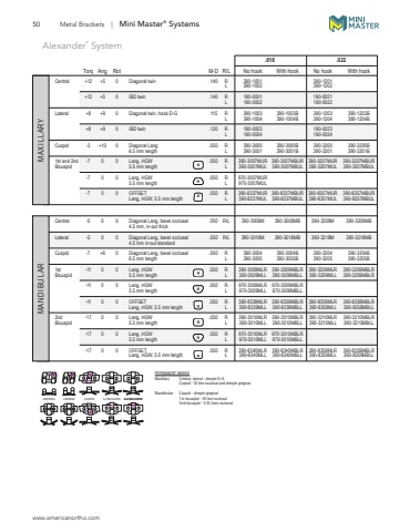 www.americanortho.com50 Metal Brackets | Mini Master%u00ae SystemsPERMANENT MARKSMaxillary Central, lateral - dimple D-GCuspid - ID line occlusal and dimple gingivalMandibular Cuspid - dimple gingival1st bicuspid - ID line occlusal2nd bicuspid - 2 ID lines occlusalCENTRAL LATERAL CUSPID 1st BICUSPID 2nd BICUSPID MANDIBULAR MAXILLARYAlexander* System .018 .022 Torq Ang Rot M-D R/L No hook With hook No hook With hookCentral +12 +5 0 Diagonal twin .140 R 390-1001 390-1201 L 390-1002 390-1202 +12 +5 0 IBD twin .140 R 190-0001 190-0021 L 190-0002 190-0022Lateral +8 +9 0 Diagonal twin, hook D-G .115 R 390-1003 390-1003B 390-1203 390-1203B L 390-1004 390-1004B 390-1204 390-1204B +8 +9 0 IBD twin .120 R 190-0003 190-0023 L 190-0004 190-0024 Cuspid -3 +10 0 Diagonal Lang .050 R 390-3000 390-3000B 390-3200 390-3200B 6.5 mm length L 390-3001 390-3001B 390-3201 390-3201B 1st and 2nd -7 0 0 Lang, HGW .050 R 390-3007MUR 390-3007MBUR 390-3207MUR 390-3207MBURBicuspid 5.5 mm length L 390-3007MUL 390-3007MBUL 390-3207MUL 390-3207MBUL -7 0 0 Lang, HGW .050 R 970-3007MUR 5.5 mm length L 970-3007MUL -7 0 0 OFFSET .050 R 390-8337MUR 390-8337MBUR 390-8357MUR 390-8357MBUR Lang, HGW, 5.5 mm length L 390-8337MUL 390-8337MBUL 390-8357MUL 390-8357MBULCentral -5 0 0 Diagonal Lang, bevel occlusal .050 R/L 390-3008M 390-3008MB 390-3208M 390-3208MB 4.5 mm, in-out thickLateral -5 0 0 Diagonal Lang, bevel occlusal .050 R/L 390-3018M 390-3018MB 390-3218M 390-3218MB 4.5 mm in-out standardCuspid -7 +6 0 Diagonal Lang, bevel occlusal .050 R 390-3004 390-3004B 390-3204 390-3204B 6.5 mm length L 390-3005 390-3005B 390-3205 390-3205B 1st -11 0 0 Lang, HGW .050 R 390-3009MLR 390-3009MBLR 390-3209MLR 390-3209MBLRBicuspid 5.5 mm length L 390-3009MLL 390-3009MBLL 390-3209MLL 390-3209MBLR -11 0 0 Lang, HGW .050 R 970-3009MLR 970-3009MBLR 5.5 mm length L 970-3009MLL 970-3009MBLL -11 0 0 OFFSET .050 R 390-8339MLR 390-8339MBLR 390-8358MLR 390-8358MBLR Lang, HGW, 5.5 mm length L 390-8339MLL 390-8339MBLL 390-8358MLL 390-8358MBLL2nd -17 0 0 Lang, HGW .050 R 390-3010MLR 390-3010MBLR 390-3210MLR 390-3210MBLRBicuspid 5.5 mm length L 390-3010MLL 390-3010MBLL 390-3210MLL 390-3210MBLL -17 0 0 Lang, HGW .050 R 970-3010MLR 970-3010MBLR 5.5 mm length L 970-3010MLL 970-3010MBLL -17 0 0 OFFSET .050 R 390-8340MLR 390-8340MBLR 390-8359MLR 390-8359MBLR Lang, HGW, 5.5 mm length L 390-8340MLL 390-8340MBLL 390-8359MLL 390-8359MBLL