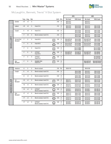 www.americanortho.com52 Metal Brackets | Mini Master%u00ae SystemsMANDIBULAR MAXILLARYMcLaughlin, Bennett, Trevisi* V-Slot System .018 .022 Torq Ang Rot M-D R/L No hook With hook No hook With hookCentral +17 +4 0 .140 R 390-6101 390-6121 L 390-6102 390-6122Lateral +10 +8 0 Hook D-G .115 R 390-6103 390-6103B 390-6123 390-6123B L 390-6104 390-6104B 390-6124 390-6124BCuspid 0 +8 0 Hook D-G .122 R 390-6105B 390-6125 390-6125B L 390-6106B 390-6126 390-6126B -7 +8 0 Bevel occlusal, hook D-G .122 R 390-6137B 390-6147 390-6147B L 390-6138B 390-6148 390-6148B1st and 2nd -7 0 0 Hook M-G .120 R 390-6007UR 390-6108B 390-6027UR 390-6128BBicuspid L 390-6007UL 390-6109B 390-6027UL 390-6129B -7 0 0 Hook M-G .120 R 970-6107UR 970-6108B 970-6127UR 970-6128B L 970-6107UL 970-6109B 970-6127UL 970-6129B -7 0 0 Hook D-G .120 R 390-6108BD 390-6128BD L 390-6109BD 390-6129BD -7 0 0 OFFSET .120 R 390-8607UR 390-8667B 390-8627UR 390-8669B Hook M-G L 390-8607UL 390-8668B 390-8627UL 390-8670B -7 0 0 OFFSET .120 R 390-8669BD Hook D-G L 390-8670BD2nd -7 0 0 RAISED PAD .120 R 390-6327UR 390-6327HDURBicuspid Hook D-G L 390-6327UL 390-6327HDULAnteriors -6 0 0 Bevel occlusal .100 R/L 390-6118 390-6158Cuspid 0 +3 0 Bevel occlusal, hook D-G .122 R 390-6139B 390-6161 390-6161B L 390-6140B 390-6162 390-6162B -6 +3 0 Bevel occlusal, hook D-G .122 R 390-6119B 390-6159 390-6159B L 390-6120B 390-6160 390-6160B1st -12 +2 0 Bevel occlusal, hook D-G .120 R 390-6111 390-6111B 390-6131 390-6131BBicuspid L 390-6112 390-6112B 390-6132 390-6132B -12 +2 0 Bevel occlusal, hook D-G .120 R 970-6111 970-6111B 970-6131 970-6131B L 970-6112 970-6112B 970-6132 970-6132B -12 +2 0 OFFSET .120 R 390-8611 390-8611B 390-8621 390-8621B Bevel occlusal, hook D-G L 390-8612 390-8612B 390-8622 390-8622B2nd -17 +2 0 Bevel occlusal, hook D-G .120 R 390-6113 390-6113B 390-6133 390-6133BBicuspid L 390-6114 390-6114B 390-6134 390-6134B -17 +2 0 Bevel occlusal, hook D-G .120 R 970-6113 970-6113B 970-6133 970-6133B L 970-6114 970-6114B 970-6134 970-6134B -17 +2 0 OFFSET .120 R 390-8671 390-8671B 390-8673 390-8673B Bevel occlusal, hook D-G L 390-8672 390-8672B 390-8674 390-8674B
