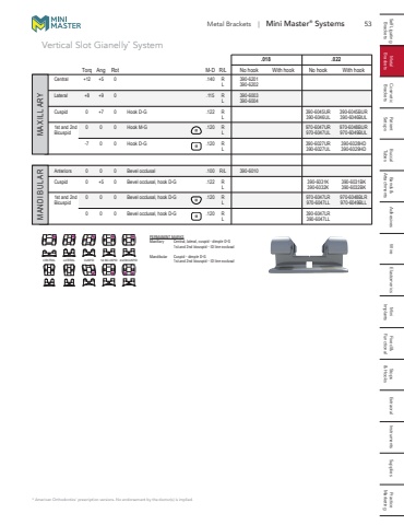 Self Ligating Metal Cosmetic Patient Buccal Bands & Adhesives Wire Elastomerics Mini Fixed & Stops Extraoral Instruments Supplies PracticeBrackets Brackets Brackets Setups Tubes Attachments Implants Functional & Hooks MarketingMetal Brackets | Mini Master 53 %u00ae SystemsPERMANENT MARKSMaxillary Central, lateral, cuspid - dimple D-G1st and 2nd bicuspid - ID line occlusalMandibular Cuspid - dimple D-G1st and 2nd bicuspid - ID line occlusal CENTRAL LATERAL CUSPID 1st BICUSPID 2nd BICUSPID* American Orthodontics%u2019 prescription versions. No endorsement by the doctor(s) is implied.Vertical Slot Gianelly* System .018 .022 Torq Ang Rot M-D R/L No hook With hook No hook With hookCentral +12 +5 0 .140 R 390-6201 L 390-6202 Lateral +8 +9 0 .115 R 390-6003 L 390-6004 Cuspid 0 +7 0 Hook D-G .122 R 390-6045UR 390-6045BUR L 390-6046UL 390-6046BUL 1st and 2nd 0 0 0 Hook M-G .120 R 970-6047UR 970-6048BURBicuspid L 970-6047UL 970-6049BUL -7 0 0 Hook D-G .120 R 390-6027UR 390-6028HD L 390-6027UL 390-6029HDAnteriors 0 0 0 Bevel occlusal .100 R/L 390-6010 Cuspid 0 +5 0 Bevel occlusal, hook D-G .122 R 390-6031K 390-6031BK L 390-6032K 390-6032BK1st and 2nd 0 0 0 Bevel occlusal, hook D-G .120 R 970-6047LR 970-6048BLRBicuspid L 970-6047LL 970-6049BLL 0 0 0 Bevel occlusal, hook D-G .120 R 390-6047LR MANDIBULARL 390-6047LLMAXILLARY
