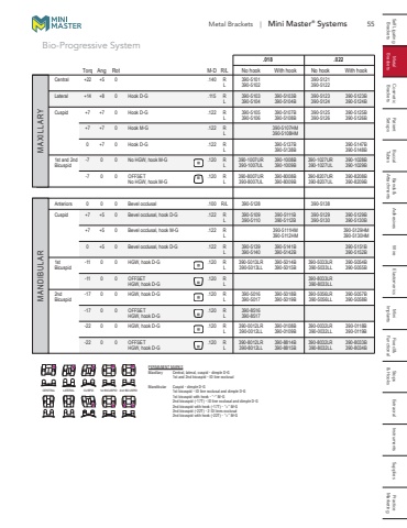 Self Ligating Metal Cosmetic Patient Buccal Bands & Adhesives Wire Elastomerics Mini Fixed & Stops Extraoral Instruments Supplies PracticeBrackets Brackets Brackets Setups Tubes Attachments Implants Functional & Hooks MarketingMetal Brackets | Mini Master 55 %u00ae SystemsPERMANENT MARKSMaxillary Central, lateral, cuspid - dimple D-G1st and 2nd bicuspid - ID line occlusalMandibular Cuspid - dimple D-G1st bicuspid - ID line occlusal and dimple D-G1st bicuspid with hook - %u201c-%u201d M-G2nd bicuspid (-17T) - ID line occlusal and dimple D-G2nd bicuspid with hook (-17T) - %u201c=%u201d M-G2nd bicuspid (-22T) - 2 ID lines occlusal2nd bicuspid with hook (-22T) - %u201c=%u201d M-GCENTRAL LATERAL CUSPID 1st BICUSPID 2nd BICUSPID MANDIBULAR MAXILLARYBio-Progressive System .018 .022 Torq Ang Rot M-D R/L No hook With hook No hook With hookCentral +22 +5 0 .140 R 390-5101 390-5121 L 390-5102 390-5122Lateral +14 +8 0 Hook D-G .115 R 390-5103 390-5103B 390-5123 390-5123B L 390-5104 390-5104B 390-5124 390-5124BCuspid +7 +7 0 Hook D-G .122 R 390-5105 390-5107B 390-5125 390-5125B L 390-5106 390-5108B 390-5126 390-5126B +7 +7 0 Hook M-G .122 R 390-5107HM L 390-5108HM 0 +7 0 Hook D-G .122 R 390-5137B 390-5147B L 390-5138B 390-5148B1st and 2nd -7 0 0 No HGW, hook M-G .120 R 390-1007UR 390-1008B 390-1027UR 390-1028BBicuspid L 390-1007UL 390-1009B 390-1027UL 390-1029B -7 0 0 OFFSET .120 R 390-8007UR 390-8008B 390-8207UR 390-8208B No HGW, hook M-G L 390-8007UL 390-8009B 390-8207UL 390-8209BAnteriors 0 0 0 Bevel occlusal .100 R/L 390-5128 390-5138Cuspid +7 +5 0 Bevel occlusal, hook D-G .122 R 390-5109 390-5111B 390-5129 390-5129B L 390-5110 390-5112B 390-5130 390-5130B +7 +5 0 Bevel occlusal, hook M-G .122 R 390-5111HM 390-5129HM L 390-5112HM 390-5130HM 0 +5 0 Bevel occlusal, hook D-G .122 R 390-5139 390-5141B 390-5151B L 390-5140 390-5142B 390-5152B1st -11 0 0 HGW, hook D-G .120 R 390-5013LR 390-5014B 390-5033LR 390-5054BBicuspid L 390-5013LL 390-5015B 390-5033LL 390-5055B -11 0 0 OFFSET .120 R 390-8033LR HGW, hook D-G L 390-8033LL2nd -17 0 0 HGW, hook D-G .120 R 390-5016 390-5018B 390-5056LR 390-5057BBicuspid L 390-5017 390-5019B 390-5056LL 390-5058B -17 0 0 OFFSET .120 R 390-8516 HGW, hook D-G L 390-8517 -22 0 0 HGW, hook D-G .120 R 390-0012LR 390-0108B 390-0032LR 390-0118B L 390-0012LL 390-0109B 390-0032LL 390-0119B -22 0 0 OFFSET .120 R 390-8012LR 390-8814B 390-8032LR 390-8033B HGW, hook D-G L 390-8012LL 390-8815B 390-8032LL 390-8034B