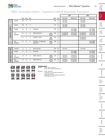 Self Ligating Metal Cosmetic Patient Buccal Bands & Adhesives Wire Elastomerics Mini Fixed & Stops Extraoral Instruments Supplies PracticeBrackets Brackets Brackets Setups Tubes Attachments Implants Functional & Hooks MarketingMetal Brackets | Mini Master 57 %u00ae SystemsPERMANENT MARKSMaxillary Central, lateral - dimple D-GCuspid - ID line occlusal and dimple D-GMandibular Cuspid - dimple D-G1st bicuspid - ID line occlusal and dimple D-G1st bicuspid with hook - %u201c-%u201d2nd bicuspid - 2 ID lines occlusal and dimple D-G2nd bicuspid with hook - %u201c=%u201dCENTRAL LATERAL CUSPID 1st BICUSPID 2nd BICUSPID MANDIBULAR MAXILLARYSEBATM Prescription System - Sugiyama Evidence-Base Asian Prescription .018 .022 Torq Ang Rot M-D R/L No hook With hook No hook With hookCentral +24 +3 0 .140 R 310-1001 310-1021 L 310-1002 310-1022Lateral +18 +6 0 .115 R 310-1003 310-1023 L 310-1004 310-1024Cuspid +8 +9 5 Hook D-G .122 R 310-1005B 310-1025B L 310-1006B 310-1026B1st -6 0 0 HGW, hook M-G .120 R 310-0007UR 310-0104B 310-0027UR 310-0114BBicuspid L 310-0007UL 310-0105B 310-0027UL 310-0115B -6 0 0 OFFSET - HGW .120 R 310-8227UR L 310-8227UL 2nd -6 0 0 OFFSET - on raised pad .120 R 310-8128BBicuspid Hook M-G L 310-8129BAnteriors +3 0 0 Bevel occlusal .100 R/L 310-1010 310-1030 Cuspid -5 +5 5 Hook D-G .122 R 310-1008B 310-1028B L 310-1009B 310-1029B 1st -12 +2 0 HGW, hook D-G .120 R 310-0011 310-0011B 310-0031BBicuspid L 310-0012 310-0012B 310-0032B2nd -17 +2 0 HGW, hook D-G .120 R 310-0013 310-0013B 310-0033BBicuspid L 310-0014 310-0014B 310-0034B