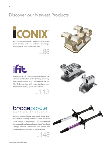 www.americanortho.com6Page88Discover our Newest ProductsPage113Page148AO%u2019s durable Mini Master%u00ae Series and LP%u00ae stainless steel brackets with an aesthetic champagne coating which rivals ceramic brackets.The expanded ifit%u00ae buccal tube line features the ultimate combination of functionality, simplicity, and patient comfort. Our Convertible tube and Mini 2nd molar tube with wraparound pad have been added to this popular product line.Bonding with confidence begins with BracePaste%u00ae, our medium viscosity adhesive which fluoresces under UV light for easy cleanup. Our comprehensive line includes BracePaste Adhesive, BracePaste Color Change adhesive, BracePaste MTP Primer, and BracePaste Band and Build LC Band Cement.