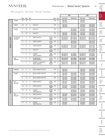 Self Ligating Metal Cosmetic Patient Buccal Bands & Adhesives Wire Elastomerics Mini Fixed & Stops Extraoral Instruments Supplies PracticeBrackets Brackets Brackets Setups Tubes Attachments Implants Functional & Hooks MarketingMetal Brackets | Master Series 61 %u00ae Systems* American Orthodontics%u2019 prescription versions. No endorsement by the doctor(s) is implied. MANDIBULAR MAXILLARYMcLaughlin, Bennett, Trevisi* System .018 .022 Torq Ang Rot M-D R/L No hook With hook No hook With hookCentral +17 +4 0 .150 R 390-0401 390-0501 L 390-0402 390-0502Lateral +10 +8 0 Hook D-G .120 R 390-0403 390-0503 390-0503B L 390-0404 390-0504 390-0504B Cuspid -7 +8 0 Hook D-G .132 R 390-0405B 390-0505 390-0505B L 390-0406B 390-0506 390-0506B 0 +8 0 Hook D-G .132 R 390-0407 390-0407B 390-0507 390-0507B L 390-0408 390-0408B 390-0508 390-0508B1st and 2nd -7 0 0 HGW, hook D-G .120 R 390-0007UR 390-0104HD 390-0027UR 390-0114HDBicuspid L 390-0007UL 390-0105HD 390-0027UL 390-0115HD -7 0 0 HGW, hook M-G .120 R 390-0104B 390-0114B L 390-0105B 390-0115B -7 0 0 HGW, hook M-G .120 R 970-0007UR 970-0104B 970-0027UR 970-0114B L 970-0007UL 970-0105B 970-0027UL 970-0115B -7 0 0 Hook D-G .120 R 970-0114HD L 970-0115HD -7 0 0 OFFSET .120 R 390-8807UR 390-8808B 390-8827UR 390-8828B HGW, hook M-G L 390-8807UL 390-8809B 390-8827UL 390-8829B2nd -7 0 0 On raised pad .120 R 390-1507UR 390-7508B 390-1607UR 390-7608BBicuspid HGW, hook M-G L 390-1507UL 390-7509B 390-1607UL 390-7609B -7 0 0 OFFSET, on raised pad .120 R 390-8177UR 390-8178B 390-8277UR 390-8278B HGW, hook M-G L 390-8177UL 390-8179B 390-8277UL 390-8279BAnteriors -6 0 0 Bevel occlusal, hook D-G .100 R 390-0433 390-0533 390-0534B L 390-0433 390-0533 390-0535BCuspid -6 +3 2 Bevel occlusal, hook D-G .132 R 390-0436 390-0436B 390-0536 390-0536B L 390-0437 390-0437B 390-0537 390-0537B 0 +3 2 Bevel occlusal, hook D-G .132 R 390-0438 390-0438B 390-0538 390-0538B L 390-0439 390-0439B 390-0539 390-0539B1st -12 +2 0 HGW, hook D-G .120 R 390-0440 390-0440B 390-0540 390-0540BBicuspid L 390-0441 390-0441B 390-0541 390-0541B -12 +2 0 HGW, hook D-G .120 R 970-0442 970-0442B 970-0542 970-0542B L 970-0443 970-0443B 970-0543 970-0543B -12 +2 0 OFFSET .120 R 390-8444B 390-8544 390-8544B HGW, hook D-G L 390-8445B 390-8545 390-8545B2nd -17 +2 0 HGW, hook D-G .120 R 390-0446 390-0446B 390-0546 390-0546BBicuspid L 390-0447 390-0447B 390-0547 390-0547B -17 +2 0 HGW, hook D-G .120 R 970-0448 970-0448B 970-0548 970-0548B L 970-0449 970-0449B 970-0549 970-0549B -17 +2 0 OFFSET .120 R 390-8450 390-8550 390-8550B HGW, hook D-G L 390-8451 390-8551 390-8551B
