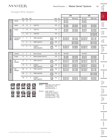 Self Ligating Metal Cosmetic Patient Buccal Bands & Adhesives Wire Elastomerics Mini Fixed & Stops Extraoral Instruments Supplies PracticeBrackets Brackets Brackets Setups Tubes Attachments Implants Functional & Hooks MarketingMetal Brackets | Master Series 63 %u00ae SystemsPERMANENT MARKSMaxillary Central, lateral, cuspid - dimple D-GCuspid with hook - %u201c-%u201d M-G1st bicuspid with hook - %u201c+%u201d2nd bicuspid with hook - %u201c+%u201dMandibular Cuspid - dimple D-GCuspid with hook - dimple D-G1st bicuspid - ID line occlusal1st bicuspid with hook - %u201c-%u201d M-G2nd bicuspid - 2 ID lines occlusal2nd bicuspid with hook - %u201c=%u201d M-GCENTRAL LATERAL CUSPID 1st BICUSPID 2nd BICUSPID* American Orthodontics%u2019 prescription versions. No endorsement by the doctor(s) is implied. MANDIBULAR MAXILLARYStraight Wire System .018 .022 Torq Ang Rot M-D R/L No hook With hook No hook With hookCentral +12 +5 0 .150 R 390-0001 390-0021 L 390-0002 390-0022Lateral +8 +9 0 Hook D-G .120 R 390-0003 390-0003B 390-0023 390-0023B L 390-0004 390-0004B 390-0024 390-0024BCuspid -7 +10 0 Hook D-G .132 R 390-0066 390-0005B 390-0076 390-0025B L 390-0067 390-0006B 390-0077 390-0026B -7 +10 0 Hook M-G .132 R 390-0025HM L 390-0026HM1st and 2nd -7 0 0 HGW, hook M-G .120 R 390-0007UR 390-0104B 390-0027UR 390-0114BBicuspid L 390-0007UL 390-0105B 390-0027UL 390-0115B -7 0 0 HGW, hook D-G .120 R 390-0104HD 390-0114HD L 390-0105HD 390-0115HD -7 0 0 OFFSET .120 R 390-8807UR 390-8808B 390-8827UR 390-8828B HGW, hook M-G L 390-8807UL 390-8809B 390-8827UL 390-8829BAnteriors 0 0 0 Bevel occlusal .100 R/L 390-0008 390-0028Cuspid -11 +7 0 Bevel occlusal, hook D-G .132 R 390-0068 390-0009B 390-0078 390-0029B L 390-0069 390-0010B 390-0079 390-0030B1st -17 0 0 HGW, hook D-G .120 R 390-0011LR 390-0106B 390-0031LR 390-0116BBicuspid L 390-0011LL 390-0107B 390-0031LL 390-0117B -17 0 0 OFFSET .120 R 390-8011LR 390-8812B 390-8031LR 390-8041B HGW, hook D-G L 390-8011LL 390-8813B 390-8031LL 390-8042B2nd -22 0 0 HGW, hook D-G .120 R 390-0012LR 390-0108B 390-0032LR 390-0118BBicuspid L 390-0012LL 390-0109B 390-0032LL 390-0119B -22 0 0 HGW, hook M-G .120 R 390-0118HM L 390-0119HM -22 0 0 OFFSET .120 R 390-8012LR 390-8814B 390-8032LR 390-8033B HGW, hook D-G L 390-8012LL 390-8815B 390-8032LL 390-8034B