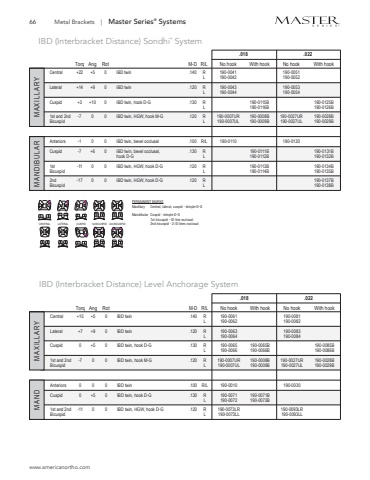 www.americanortho.com66 Metal Brackets | Master Series%u00ae SystemsPERMANENT MARKSMaxillary Central, lateral, cuspid - dimple D-GMandibular Cuspid - dimple D-G1st bicuspid - ID line occlusalCENTRAL LATERAL CUSPID 2nd bicuspid - 2 ID lines occlusal 1st BICUSPID 2nd BICUSPID MANDIBULAR MAND MAXILLARY MAXILLARYIBD (Interbracket Distance) Sondhi* System .018 .022 Torq Ang Rot M-D R/L No hook With hook No hook With hookCentral +22 +5 0 IBD twin .140 R 190-0041 190-0051 L 190-0042 190-0052Lateral +14 +9 0 IBD twin .120 R 190-0043 190-0053 L 190-0044 190-0054Cuspid +3 +10 0 IBD twin, hook D-G .130 R 190-0115B 190-0125B L 190-0116B 190-0126B1st and 2nd -7 0 0 IBD twin, HGW, hook M-G .120 R 190-0007UR 190-0008B 190-0027UR 190-0028BBicuspid L 190-0007UL 190-0009B 190-0027UL 190-0029BAnteriors -1 0 0 IBD twin, bevel occlusal .100 R/L 190-0110 190-0130Cuspid -7 +6 0 IBD twin, bevel occlusal, .130 R 190-0111B 190-0131B hook D-G L 190-0112B 190-0132B1st -11 0 0 IBD twin, HGW, hook D-G .120 R 190-0113B 190-0134BBicuspid L 190-0114B 190-0135B2nd -17 0 0 IBD twin, HGW, hook D-G .120 R 190-0137BBicuspid L 190-0138BIBD (Interbracket Distance) Level Anchorage System .018 .022 Torq Ang Rot M-D R/L No hook With hook No hook With hookCentral +15 +5 0 IBD twin .140 R 190-0061 190-0081 L 190-0062 190-0082Lateral +7 +9 0 IBD twin .120 R 190-0063 190-0083 L 190-0064 190-0084Cuspid 0 +5 0 IBD twin, hook D-G .130 R 190-0065 190-0065B 190-0085B L 190-0066 190-0066B 190-0086B1st and 2nd -7 0 0 IBD twin, hook M-G .120 R 190-0007UR 190-0008B 190-0027UR 190-0028BBicuspid L 190-0007UL 190-0009B 190-0027UL 190-0029BAnteriors 0 0 0 IBD twin .100 R/L 190-0010 190-0030Cuspid 0 +5 0 IBD twin, hook D-G .130 R 190-0071 190-0071B L 190-0072 190-0072B 1st and 2nd -11 0 0 IBD twin, HGW, hook D-G .120 R 190-0073LR 190-0093LR Bicuspid L 190-0073LL 190-0093LL