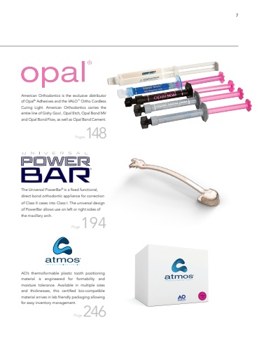 7Page 194Pages148AO%u2019s thermoformable plastic tooth positioning material is engineered for formability and moisture tolerance. Available in multiple sizes and thicknesses, this certified bio-compatible material arrives in lab friendly packaging allowing for easy inventory management.Page 246The Universal PowerBar%u00ae is a fixed functional, direct bond orthodontic appliance for correction of Class II cases into Class I. The universal design of PowerBar allows use on left or right sides of the maxillary arch.American Orthodontics is the exclusive distributor of Opal%u00ae Adhesives and the VALO%u2122 Ortho Cordless Curing Light. American Orthodontics carries the entire line of Gishy Goo!, Opal Etch, Opal Bond MV and Opal Bond Flow, as well as Opal Band Cement.
