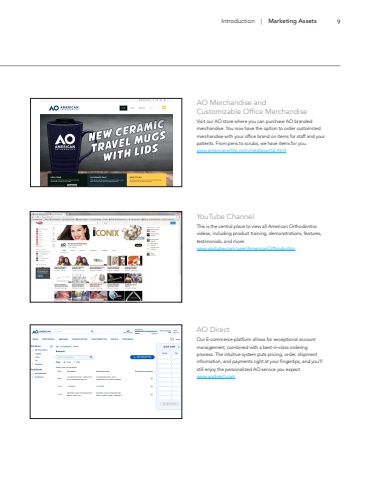 Introduction | Marketing Assets 9YouTube ChannelThis is the central place to view all American Orthodontics videos, including product training, demonstrations, features, testimonials, and more.www.youtube.com/user/AmericanOrthodonticsAO Merchandise andCustomizable Office MerchandiseVisit our AO store where you can purchase AO branded merchandise. You now have the option to order customized merchandise with your office brand on items for staff and your patients. From pens to scrubs, we have items for you.www.americanortho.com/mediaportal.htmlAO DirectOur E-commerce platform allows for exceptional account management, combined with a best-in-class ordering process. The intuitive system puts pricing, order, shipment information, and payments right at your fingertips, and you%u2019ll still enjoy the personalized AO service you expect. www.aodirect.com