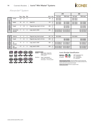 www.americanortho.com94 Cosmetic Brackets | Iconix%u00ae Mini Master%u00ae SystemsIconix Bracket IdentificationBRACKET ID HGW: high gingival wingColor coded D-G: distal/gingivalby quadrant M-G: mesial/gingivalVS: vertical slotOFFSET BICUSPID OPTIONS: Gingivally OFFSET bicuspid brackets offer a larger bonding base covering more area on the occlusal one third of the buccal surface and increasing bond strength.RAISED PAD OPTIONS: Blue dot on gingival of pad.PERMANENT MARKSMaxillary Central, lateral - dimple D-GCuspid - ID line occlusal and dimple gingivalMandibular Cuspid - dimple gingival1st bicuspid - ID line occlual2nd bicuspid - 2 ID lines occlusalCENTRAL LATERAL CUSPID 1st BICUSPID 2nd BICUSPID MANDIBULAR MAXILLARYAlexander* System .018 .022 Torq Ang Rot M-D R/L No hook With hook No hook With hookCentral +12 +5 0 .140 R 390-1001G 390-1201G L 390-1002G 390-1202GLateral +8 +9 0 Hook D-G .115 R 390-1003G 390-1003BG 390-1203G 390-1203BG L 390-1004G 390-1004BG 390-1204G 390-1204BGCuspid -3 +10 0 Diagonal Lang, hook G, 6.5 mm .050 R 390-3000BG 390-3200BG L 390-3001BG 390-3201BG1st and 2nd -7 0 0 Lang, hook G, HGW .050 R 390-3007MGUR 390-3007BGUR 390-3207BGURBicuspid L 390-3007MGUL 390-3007BGUL 390-3207BGULAnteriors -5 0 0 Diagonal Lang, bevel occlusal .050 R/L 390-3008G 390-3208GCuspid -7 +6 0 Diagonal Lang, hook G, 6.5 mm .050 R 390-3004BG 390-3204BG L 390-3005BG 390-3205BG1st -11 0 0 Lang, hook G, HGW .050 R 390-3009MGLR 390-3009BGLR 390-3209BGLRBicuspid L 390-3009MGLL 390-3009BGLL 390-3209BGLL2nd -17 0 0 Lang, hook G, HGW .050 R 390-3010MGLR 390-3010BGLR 390-3210BGLRBicuspid L 390-3010MGLL 390-3010BGLL 390-3210BGLL