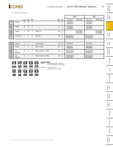 95 Self Ligating Metal Cosmetic Patient Buccal Bands & Adhesives Wire Elastomerics Mini Fixed & Stops Extraoral Instruments Supplies Practice Brackets Brackets Brackets Setups Tubes Attachments Implants Functional & Hooks MarketingCosmetic Brackets | Iconix%u00ae Mini Master%u00ae SystemsPERMANENT MARKSMaxillary Central, lateral, cuspid - dimple D-G1st and 2nd bicuspid - ID line occlusalMandibular Cuspid - dimple D-G CENTRAL 2nd bicuspid - ID lines occlusal LATERAL CUSPID 1st BICUSPID 2nd BICUSPID* American Orthodontics%u2019 prescription versions. No endorsement by the doctor(s) is implied. MANDIBULAR MAXILLARYV-Slot System .018 .022 Torq Ang Rot M-D R/L No hook With hook No hook With hookCentral +14 +5 0 .140 R 390-6001G 390-6021G L 390-6002G 390-6022GLateral +8 +9 0 .115 R 390-6003G 390-6023G L 390-6004G 390-6024GCuspid -2 +10 0 Hook D-G .122 R 390-6005BG 390-6025BG L 390-6006BG 390-6026BG1st and 2nd -7 0 0 No HGW .120 R 390-6007GUR 390-6027GUR L 390-6007GUL 390-6027GULAnteriors 0 0 0 Bevel occlusal .100 R/L 390-6010G 390-6030GCuspid -7 +7 0 Bevel occlusal .122 R 390-6011G 390-6031G L 390-6012G 390-6032G1st -11 0 0 Bevel occlusal, no HGW .120 R 390-6013GLR 390-6033GLRBicuspid L 390-6013GLL 390-6033GLL2nd -17 0 0 Bevel occlusal, no HGW .120 R 390-6016GLR 390-6036GLRBicuspid L 390-6016GLL 390-6036GLL