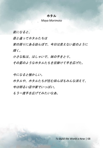 ホタル Maya Morimoto 夜になると、 昼と違ってホタルたちは 家の周りにある田んぼで、今日は見えない星のように 輝く。 小さな私は、はしゃいで、妹の手をとり、 その星のようなホタルたちを目掛けて手を広げた。 今になると懐かしい。 ホタルや、ホタルたちが住む田んぼもみんな消えて、 今は明るい店や家でいっぱい。 もう一度手を広げてみたいなあ。 To Build the World a New | 68