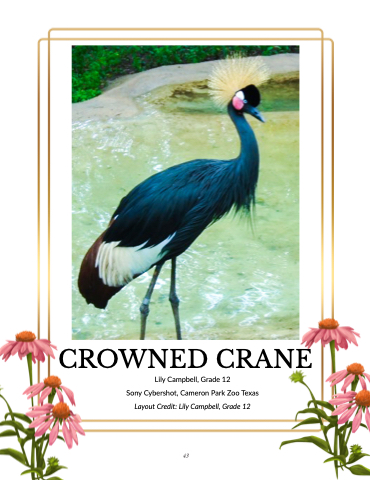 CROWNED CRANE Lily Campbell, Grade 12 Sony Cybershot, Cameron Park Zoo Texas Layout Credit: Lily Campbell, Grade 12 43