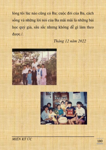 lòng tôi lúc nào cũng có Ba; cuộc đời của Ba, cách sống và những lời nói của Ba mãi mãi là những bài học quý giá, sâu sắc nhưng không dễ gì làm theo được./. Tháng 12 năm 2022 MIỀN KÝ ỨC 180