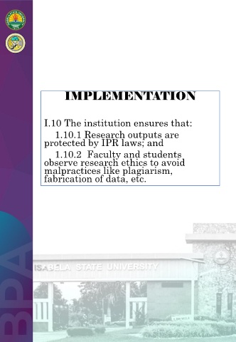 IMPLEMENTATION I.10 The institution ensures that: 1.10.1 Research outputs are protected by IPR laws; and 1.10.2 Faculty and students observe research ethics to avoid malpractices like plagiarism, fabrication of data, etc.