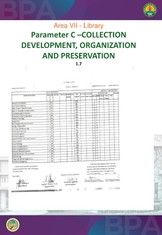 Area VII - Library Parameter C –COLLECTION DEVELOPMENT, ORGANIZATION AND PRESERVATION 1.7