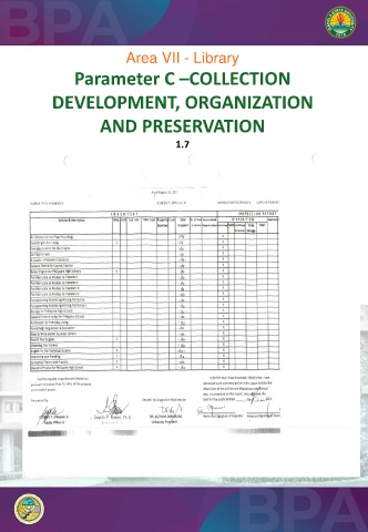 Area VII - Library Parameter C –COLLECTION DEVELOPMENT, ORGANIZATION AND PRESERVATION 1.7