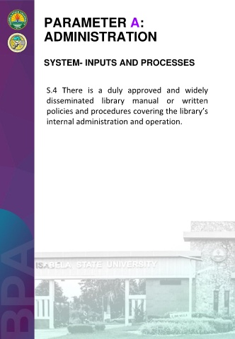 PARAMETER A: ADMINISTRATION SYSTEM- INPUTS AND PROCESSES S.4 There is a duly approved and widely disseminated library manual or written policies and procedures covering the library’s internal administration and operation.