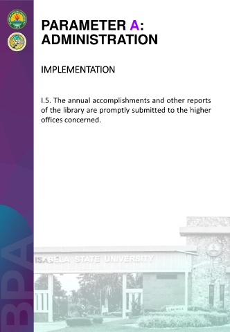 PARAMETER A: ADMINISTRATION IMPLEMENTATION I.5. The annual accomplishments and other reports of the library are promptly submitted to the higher offices concerned.