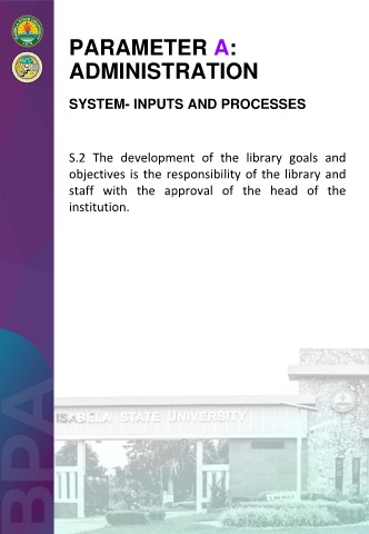 PARAMETER A: ADMINISTRATION SYSTEM- INPUTS AND PROCESSES S.2 The development of the library goals and objectives is the responsibility of the library and staff with the approval of the head of the institution.