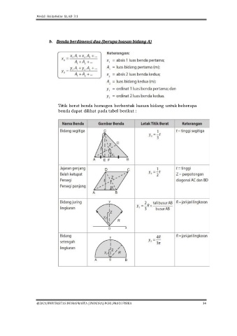 Modul Fisika Kelas XI, KD 3.1 b. Benda berdimensi dua (berupa luasan bidang A) Titik berat benda homogen berbentuk luasan bidang untuk beberapa benda dapat dilihat pada tabel berikut : @2021,UNIVERSITAS INDRAPRASTA (UNINDRA) PGRI ,PRODI FISIKA 34