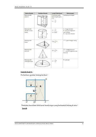 Modul Fisika Kelas XI, KD 3.1 Contoh Soal 4 : Perhatikan gambar bidang berikut ! Tentukan koordinat titik berat benda tegar yang berbentuk bidang di atas ! Jawab @2021,UNIVERSITAS INDRAPRASTA (UNINDRA) PGRI ,PRODI FISIKA 36