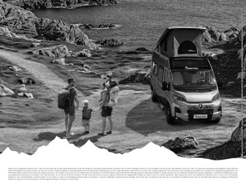 Fahrtkosten gehen zulasten des Kunden. Die Reisemobile, Vans und Camper Vans werden für die Freizeitnutzung entwickelt und sind keinesfalls als permanente Wohnlösungen gedacht. Bestimmte Modelle in diesem Katalog sind mit wahlweise erhältlichem Zubehör abgebildet. Unverbindliche Abbildungen: Ges-
