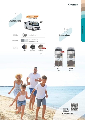 1 Ausführung 140 PS / 103 kW 2 INTEGRIERTE Getriebe Schaltgetriebe Grundrisse Weiße Karosserie Exterieur und graue Wände Interieur NEW Alto Brooklyn Bombay (1) NEW (1) Optional 7057 7068 7,47 m 7,47 m + INFOS AUF chausson-reisemobile.de - 59 -