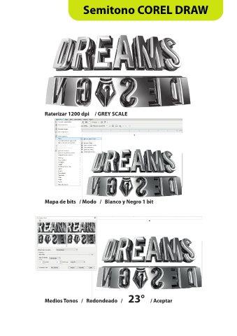 Semitono COREL DRAW Raterizar 1200 dpi / GREY SCALE Mapa de bits / Modo / Blanco y Negro 1 bit Medios Tonos / Redondeado / 23° / Aceptar