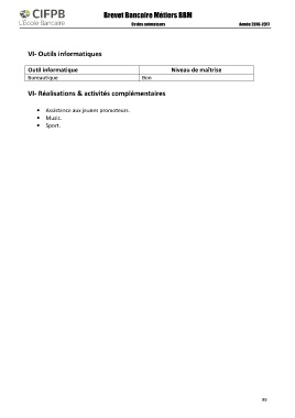 Brevet Bancaire Métiers BBM Année 2016-2017 Cv des animateurs VI- Outils informatiques Outil informatique Niveau de maîtrise Bureautique Bon VI- Réalisations & activités complémentaires • Assistance aux jeunes promoteurs. • Music. • Sport. 99